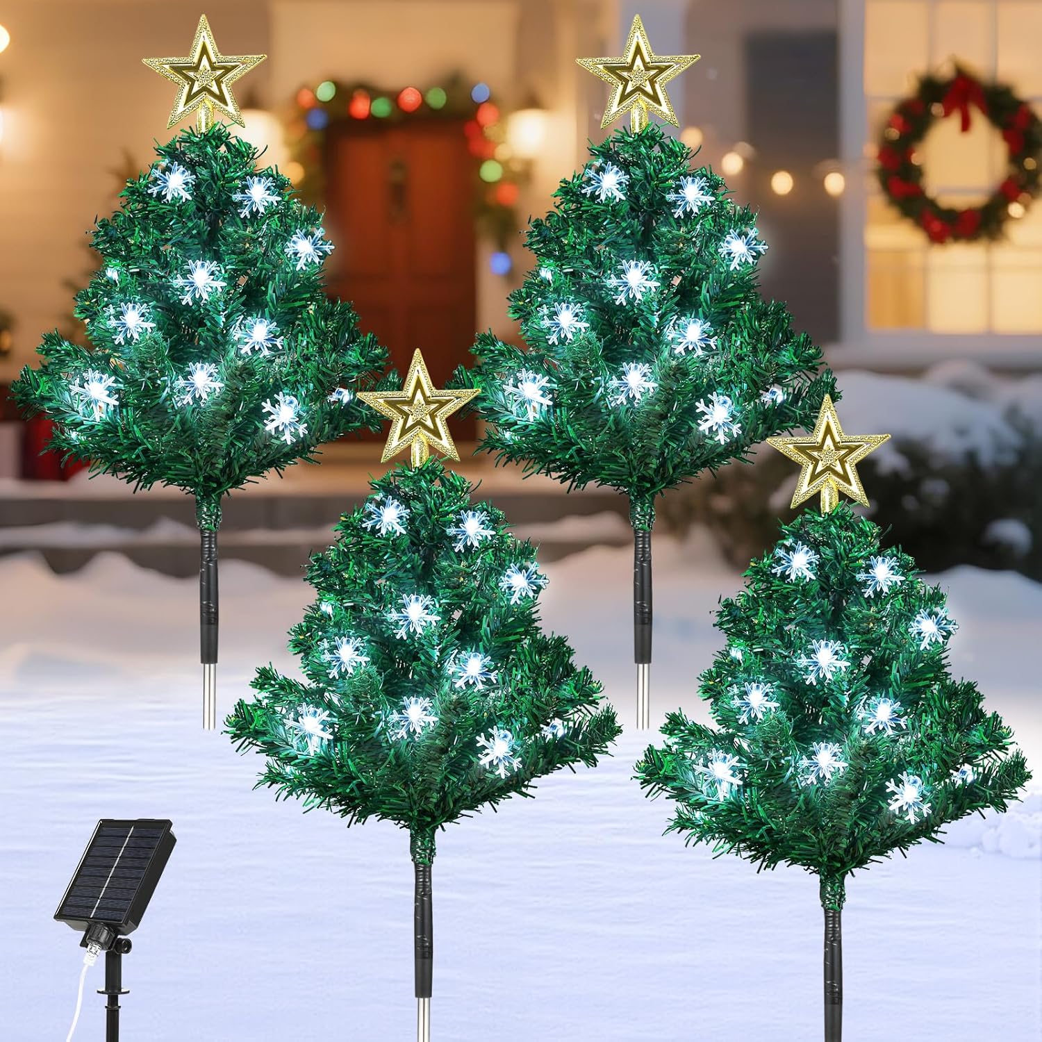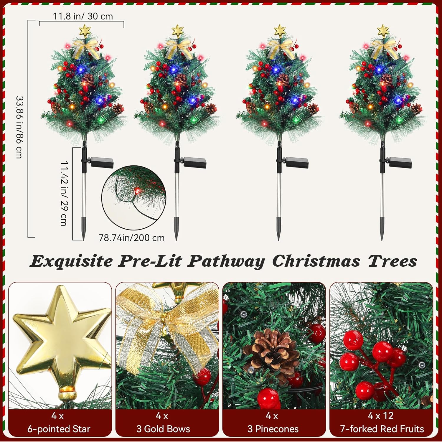 Lewondr Prelit Outdoor Christmas Trees for PorchFeatures1. Classic Decorations: The evergreen branches of the pre-lit Christmas tree are adorned with 4 x 6-pointed Star, 12 x Red Bows, 24 x Bells, 80 x Small Red Fruits, 4 x 20 LED Strawberry Lights. These decorations create a vivid and festive color collision, naturally blending with existing Christmas decor to instantly create a sense of festive ritual.2. Flexible Placement: It can be symmetrically displayed on both sides of doorways, along courtyard paths, or in gardens. It can also be placed in the corner of the living room, beside the dining table, or by the bedroom door.3. Multiple Lighting Modes: When lit, the warm white lights make your artificial prelit Christmas tree dazzle with light and color. It supports constant light and flashing modes.4. Tool-Free Installation: The 3 stainless steel ground stakes of the Christmas tree can be easily inserted into grass to secure it firmly, and can be simply lifted vertically to remove. SpecificationOutdoor Porch Christmas Tree Size: 33.86 in/86 cm × 11.81 in/30 cmGround Stake Height: 11.42 in/ 29 cmPacking List4 x Outdoor Pathway Christmas Trees