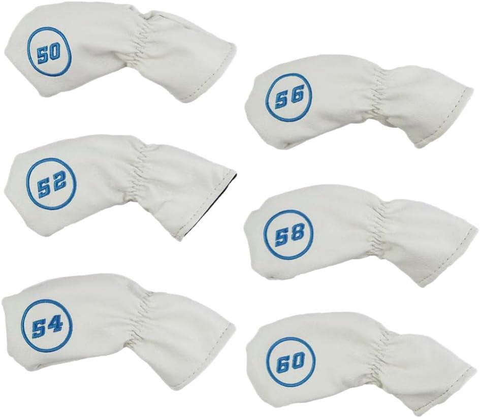 Description: - This golf iron putter head covers made of super soft PU leather with think fleece liner- small and exquisite appearance - Soft, Waterproof simply slide into your while hitting - Drawstring in the middle prevents the cover from falling - Provide protection for your golf irons from dings, scratches and damage during playing or traveling as well as weather element - Embroidery 50,52,54,56,58,60 for easy recognitionSpecification: - Material: PU Leather - Size: Approx. 20x18x4cm/7.87x7.07x1.57inchPackage Includes:6 Pieces Golf Club Head Cover:Color might be slightly different due to the color calibration of each individual monitor.Please allow slightly measuring deviation due to manual measurement.