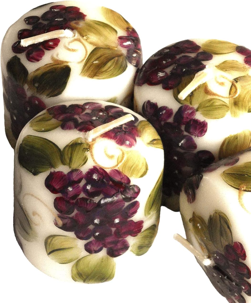 A charming set of four decorated ivory votive candles with hand-painted clusters of grapes, green leaves, and golden swirl accents that will add Mediterranean style to your decor! And each candle is a unique piece of usable art, individually painted using quality paints that will not affect the candles' burning! Display them in pretty votive holders or group them together to create a beautiful dinner party tablescape! Set of Four Little Votive Candles 1 1/2" high, 1 1/2" wide **Your set of candles arrive to you in a gift bag tied with a pretty bow!**