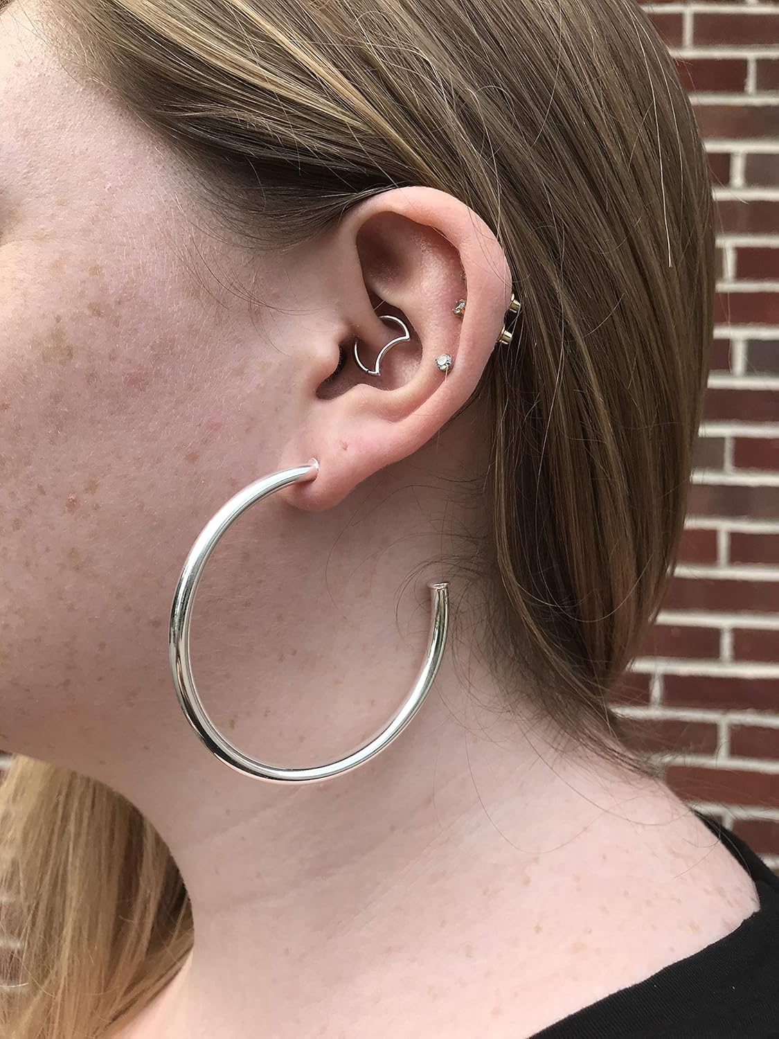 The Everybody's Favorite hoop earring from Sheila Fajl is a favorite of nearly everyone! It is a best selling style that has been photographed many times on various celebrities. These Sheila Fajl Everybody's Favorite Large 2.5 Inch Tubular Lightweight Statement Hoop Earrings in Shiny Polished Silver Plated have a lightweight, hollow tube design that makes them super comfortable to wear. The large, bold tubular design makes these hoops stand-out without all the weight of classic statement earrings. Our owner owns them in every color! You will find both brush and polished finish versions, in various metals, in our store. Because this design is a fan favorite, Sheila created the Smaller Favorite at 2 inches and Petite Favorite at 1.50 inches. We offer these styles too in multiple metals, as well - check them out too! We love Sheila Fajl jewelry because it's unique, and handmade with care in Brazil. Because each piece is handmade, no item is perfect or identical! It is very likely the item will vary from the stock photo provided. We offer model images for size reference only. Please keep in mind, the item you see in the model photo is not the exact item you will receive.