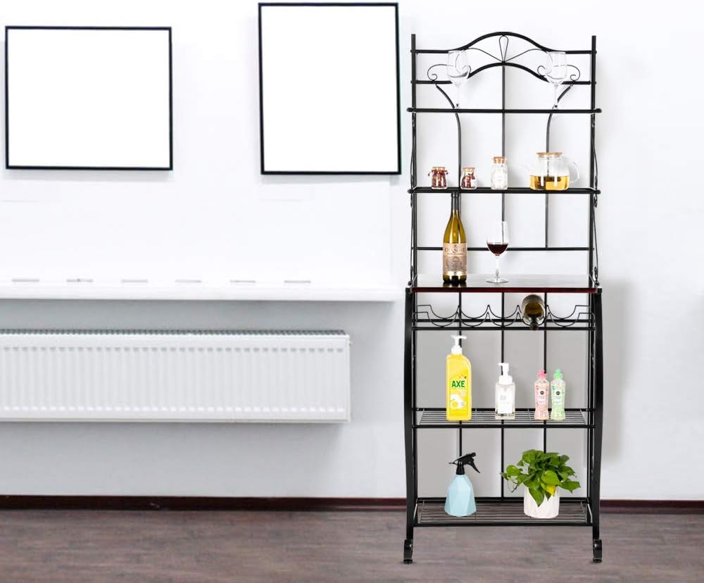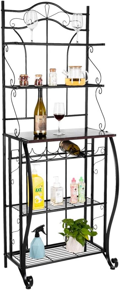 Introductions:Do you add a beautiful decoration to your kitchen? We recommend this 5-Tier Metal Kitchen Rack Metal Kitchen Bakers for you. This rack is made of metal, which made it more durable. Exquisitely carved designs decorate your kitchen. This shelf can help you to store bowls, wine and spices and provide you a clean tidy kitchen. Beautiful things bring you good mood. What are you waiting for? It will not let you down.Features:1. Metal material is more durable2. Exquisitely carved designs decorate your Kitchen3. Beautiful things bring you good mood4. 5-Tier rack can store more things5. The powder coated finish is smooth and thick enough to avoid fading and peeling6. Help you to store bowls, wine and spices and provide you a clean tidy kitchenSpecifications:1. Dimensions: (25 x 15.5 x 68.5)" / (63.5 x 39.37 x 173.99)cm (L x H)2. Material: Iron3. Tire: 54. Color: Black5. Weight Capacity: 110lb / 49.9kg6. Weight: 36lb / 16.33kg7. Top Shelf Dimensions: (25 x 7.5 x 10)" / (63.5 x 19.05 x 25.4)cm (L x W x H)8. Middle Shelf Dimensions: (25 x 15.25 x 14)" / (63.5 x 38.74 x 35.56)cm (L x W x H)9. Bottom Shelf Dimensions: (23 x 10 x 14)" / (58.42 x 25.4 x 35.56)cm (L x W x H)Package Includes:1 x 5-Tier Metal Kitchen Rack