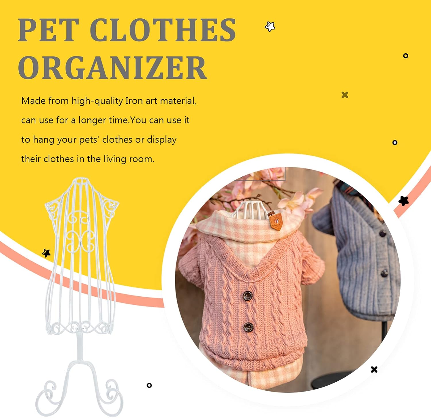 Package Include 2 x Clothing Rack Characteristics - You can use it to' clothes or display their clothes in the living room. - Size: Approx. 41.00X14.00X14.00cm; 16.11X5.50X5.50in - Great and thoughtful gift for your friend keeping pets. - Made from high- quality Iron art material, can use for a time. - Color: As Shown - Material: Iron art - Keep your pet' s clothing neat and organized. A good choice for you. - Suitable for home and pet shop use, a nice hanger for you. Goods Description Are you looking for a portable and practical pet clothes hanger? Are you in search of a reliable and convenient hanger that can be used for the long time? If yes, look no further! Our premium pet clothes hanger must meet your needs. one of the best choices for you.