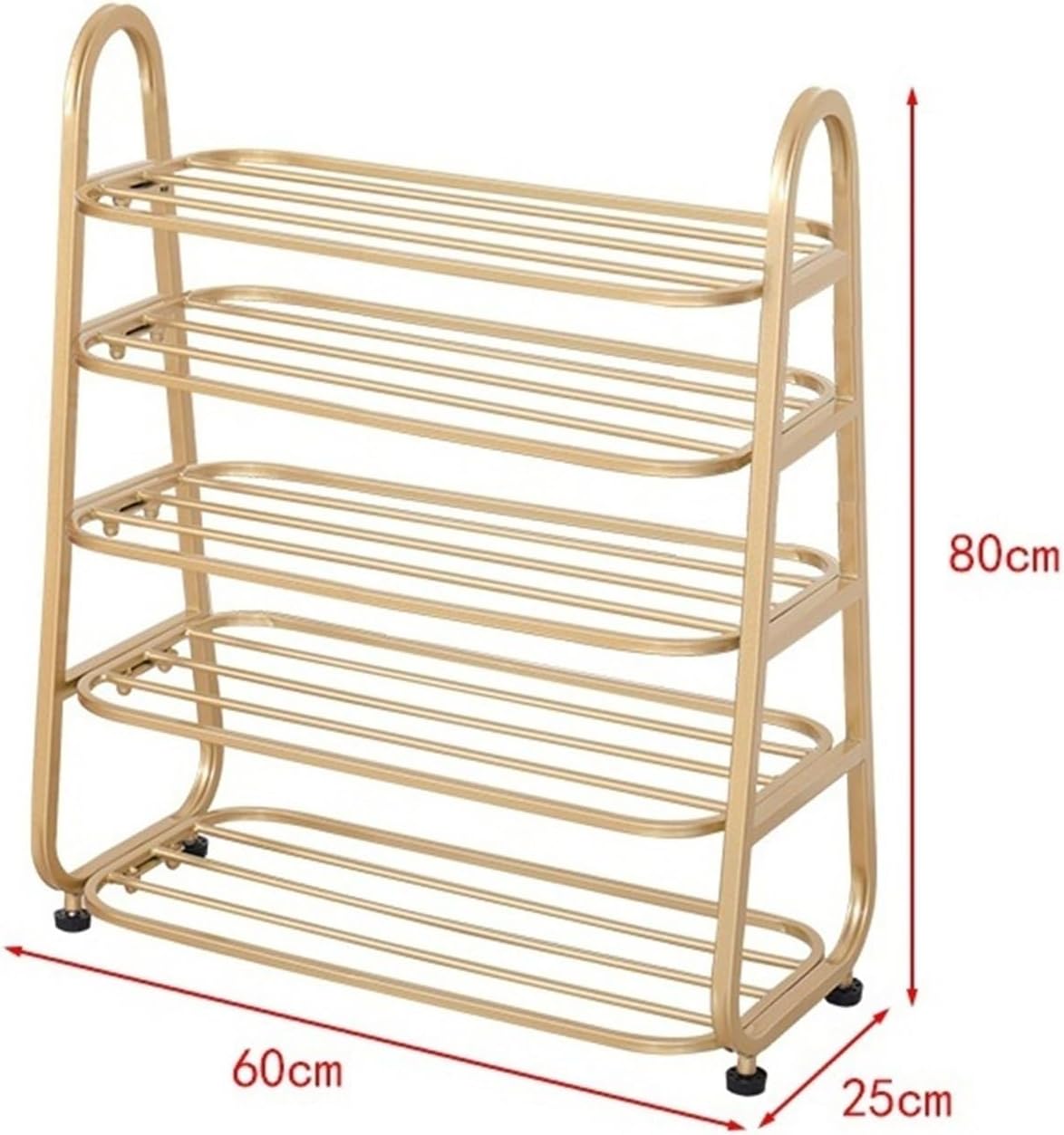 This shoe rack makes everything look beautiful and it will match almost any decor.3/4/5 Tier Free Standing Shoe Racks, Gold Modern Shoe Racks with Adjustable Foot Pads, Metal Shoe Storage Organizers for Entryway Hallway ClosetProduct Name: Gold Modern Shoe Rack OrganizerMaterial: Metal Color: GoldDimensions: 45*25*45cm , 60*25*60cm , 80*25*60cm , 100*25*60cm , 60*25*80cm , 80*25*80cm , 100*25*80cmPacking list: 1 * Modern Free Standing Shoe RackNote:1. Please check the size and color before purchasing.2. Does not include items other than those shown in the product photo.3. Please note that due to the different monitors, slight chromatic aberration may occur, please understand.4. The above data is for reference only, the size is manual measurement, each variable may be different, please refer to the actual product, thank you.