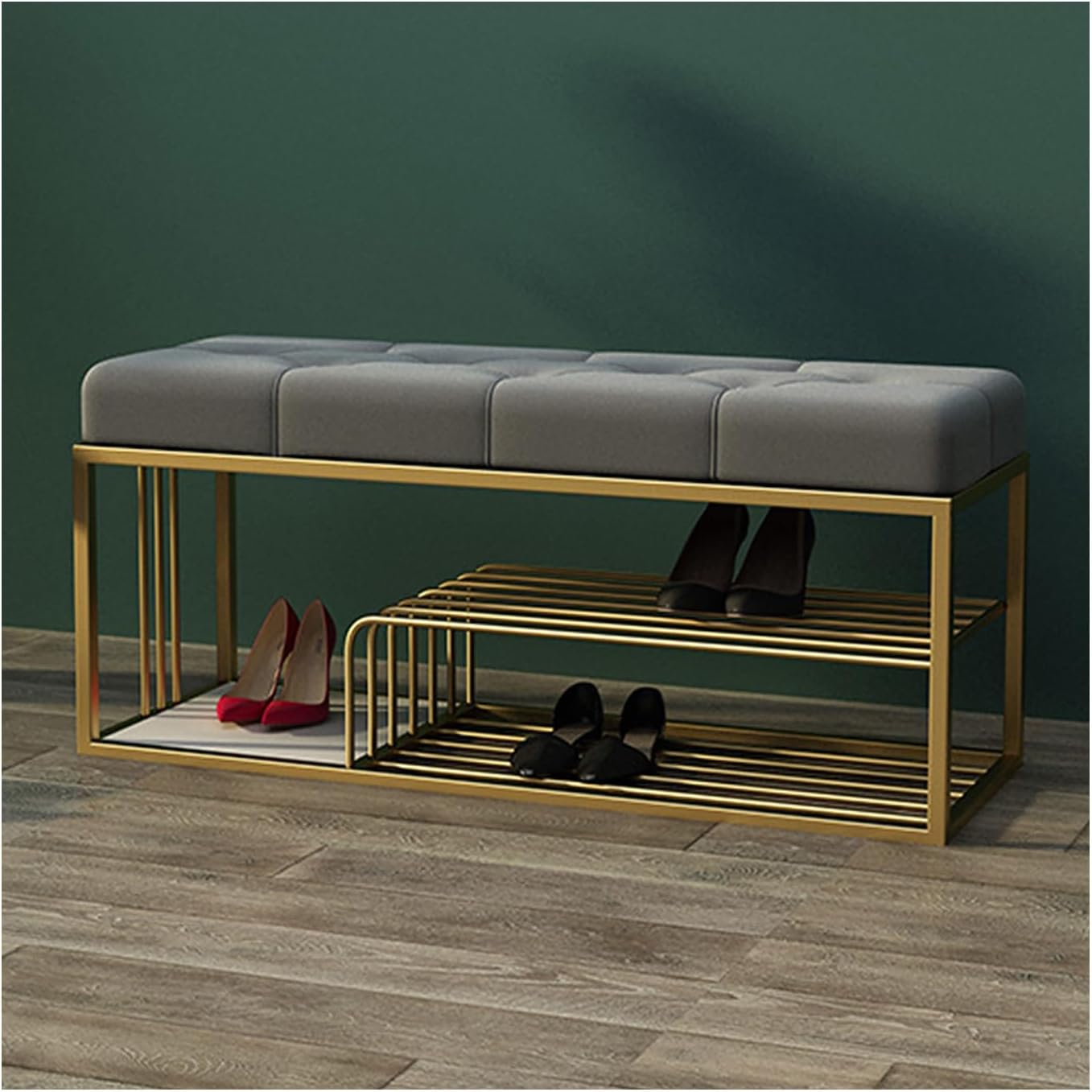 Instead of hopping around on one leg trying to put on shoes, why not sit comfortably on this shoe bench to lace up? With a padded seat and shelves, this shoe bench will never let you down!Stable Shoe Bench Rack: Bolstered by a sturdy metal frame, this shoe rack can hold your purse and handbag in your entry and corral your most commonly worn shoes of the season in your bedroom or cloakroom, or just about anything else you throw its way.Features:Cozy SittingHigh-density foam cushion offers maximum comfort when you sit on it.Steel FrameThe metal frame makes this shoe bench sturdy, durable, and stable.Shoe Storageshelves hold up to multiple pairs of shoes, meeting your daily storage demands.Includes Foot PadsFoot pads prevent the bench from slipping and protect your floor from scratches.Multifunctional Storage ShelfGreat fits for your hallway, entryway, front door, foyer, living room, bedroom or bathroom.Specifications:Color: Gray, Pink, GreenMaterial: Metal Frame, Velvet Fabric, High-Resilience SpongeProduct Size: 31”L x 12”W x 18”H (80 x 30 x 45 cm)/39”L x 12”W x 18”H (100 x 30 x 45 cm)Package Contents:1 x Shoe Bench