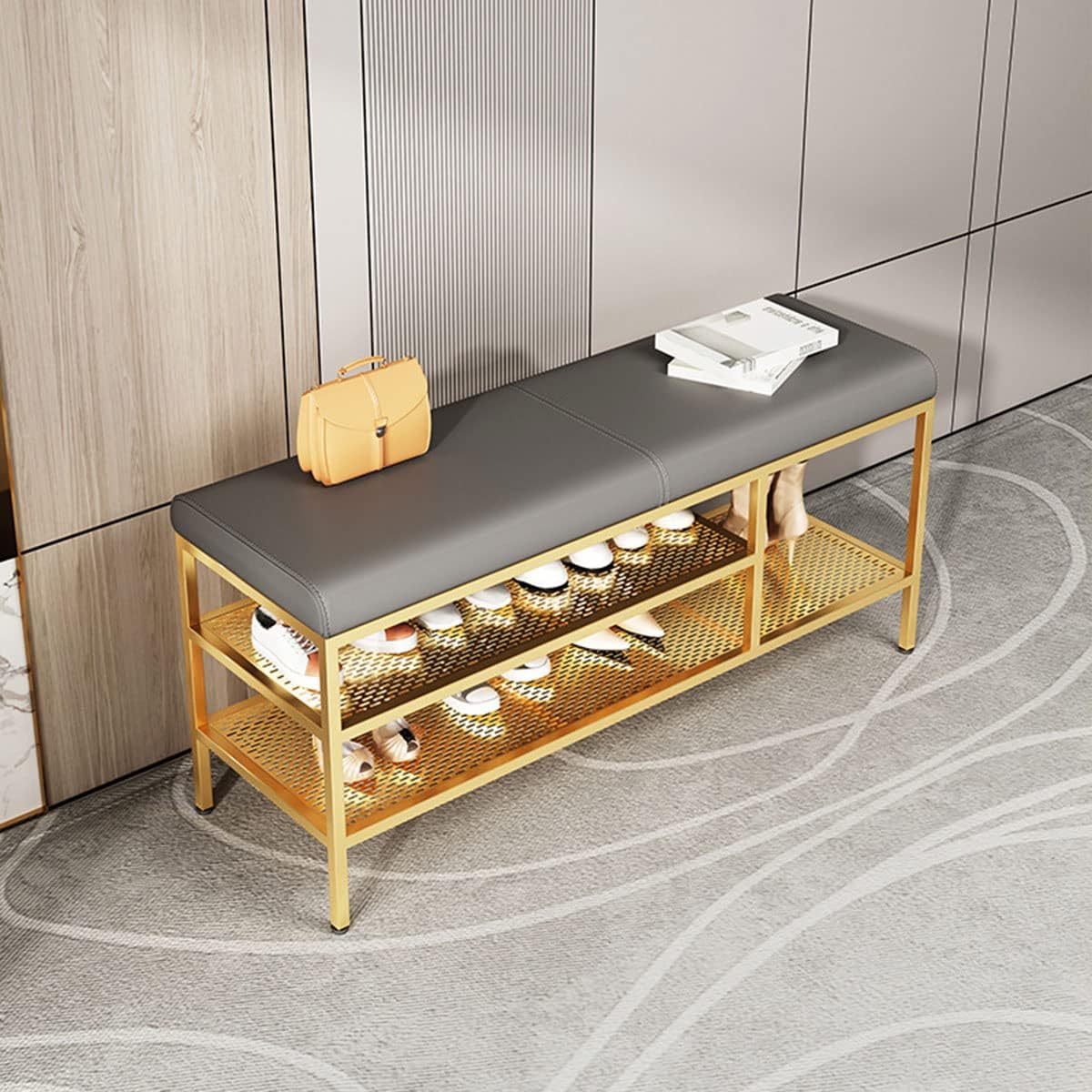 Hallway Bench 2 Tier Free Standing Shoe Rack, with Padded Seat Cushion, Shoe Bench, Shoe Storage Stool, for Living Room, Bedroom, Hallway Effortless Placement: This shoe changing stool may be small in size (60cm) but it plays a big role in transforming your home. Whether you place it by the door, in the hallway, or in the living room, its compact design allows for easy placement anywhere you desire. Sleek Design: With its simple lines and metallic texture, this stool exudes a sense of security and light luxury. The box type design adds a touch of elegance to any space, creating a high-end and exquisite three-dimensional look. Hollow Panel: Featuring multiple storage compartments and a clever partitioning system, this stool offers convenient storage solutions. The hollow panel design not only increases the sense of space but also enhances the overall aesthetic of the room. Specifications: Name: Light Luxury Shoe Changing Stool Style: Light Luxury Minimalist Material: Leather, High Resilience Sponge, Iron, Foot Pad Colors: Gray, Beige, Brown Please note: Measurements may have a slight error of 1-3cm. Please refer to the actual product for accurate dimensions. Explore our store for more similar popular products and discover unique styles and features.