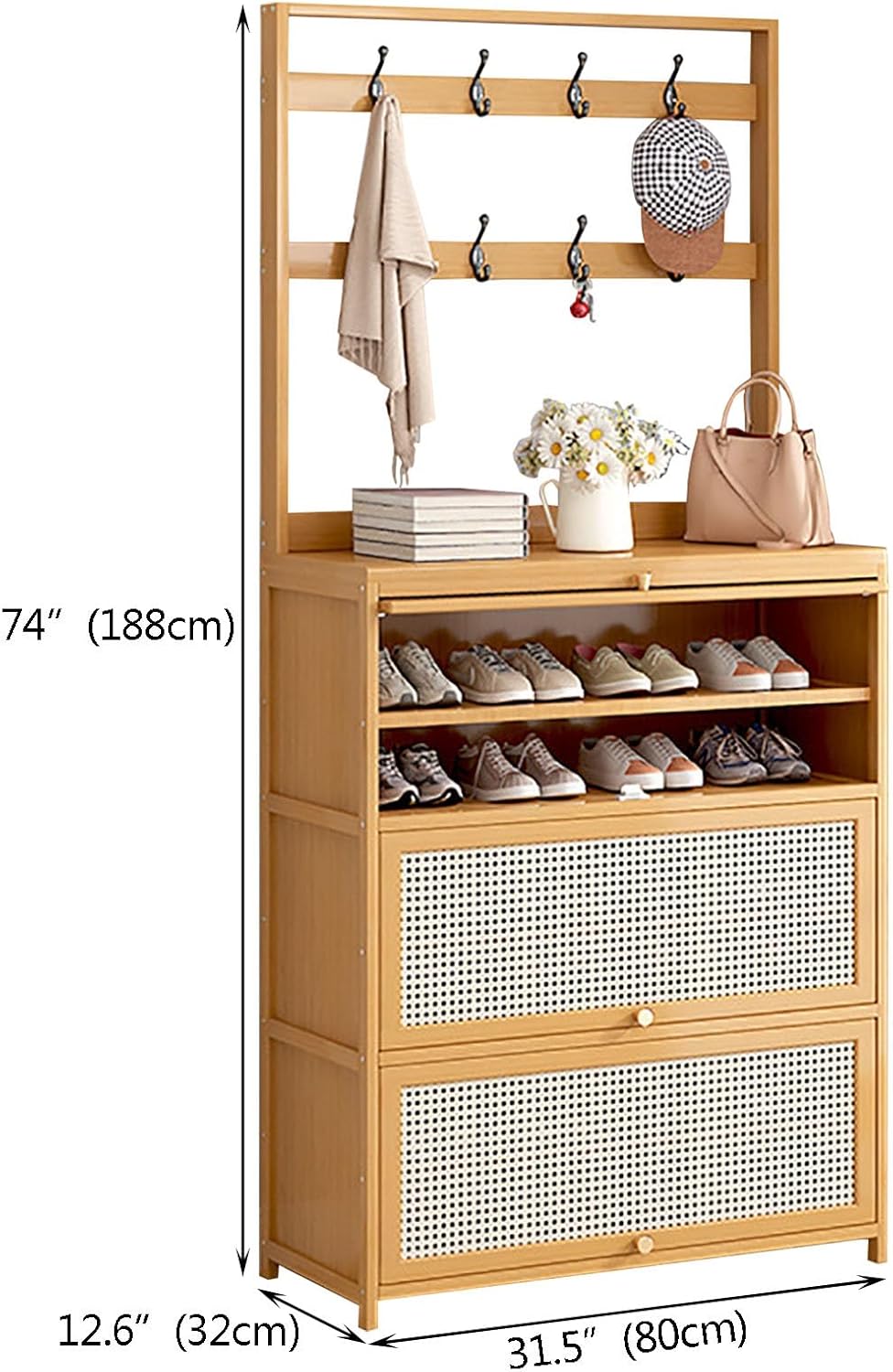 Elevate your home decor with our exquisite buffet cabinet, a perfect blend of classic elegance and modern design. This versatile piece not only enhances your living space but also serves as a functional storage solution. Whether placed in your living room, study, or porch, it adds a refreshing touch that transforms any dull area into a stylish retreat. Crafted with care, our buffet cabinet features rattan decorations and geometric patterns that exude sophistin. Made from high-quality bamboo, it offers impressive load-bearing capacity, ensuring durability for everyday use. The innovative 3-tier flip drawers provide ample storage for your family's footwear, accommodating approximately 18 to 24 pairs while keeping your space nized. Utilize the spacious top to display albums, alarm clocks, or decorative items, creating a personalized touch to your decor. The hanging area is perfect for storing clothes and hats, making it a practical addition to any room. The delicate handles are designed for comfort, offering a smooth grip while protecting your hands from scratches. Available in natural and brown finishes, our buffet cabinet combines style with functionality. With dimensions of 23.6" L x 12.6" W x 74" H, 27.6" L x 12.6" W x 74" H, and 31.5" L x 12.6" W x 74" H, it seamlessly fits into various spaces. Weighing between 27.4 lbs and 34 lbs, it is both sturdy and manageable. Please note that due to manual measurements, some variations may occur. Additionally, colors may differ slightly from the images due to display settings and lighting conditions. Refer to the actual product for an accurate representation. Embrace the blend of style and practicality with our buffet cabinet, designed to enhance your home while meeting your storage needs.