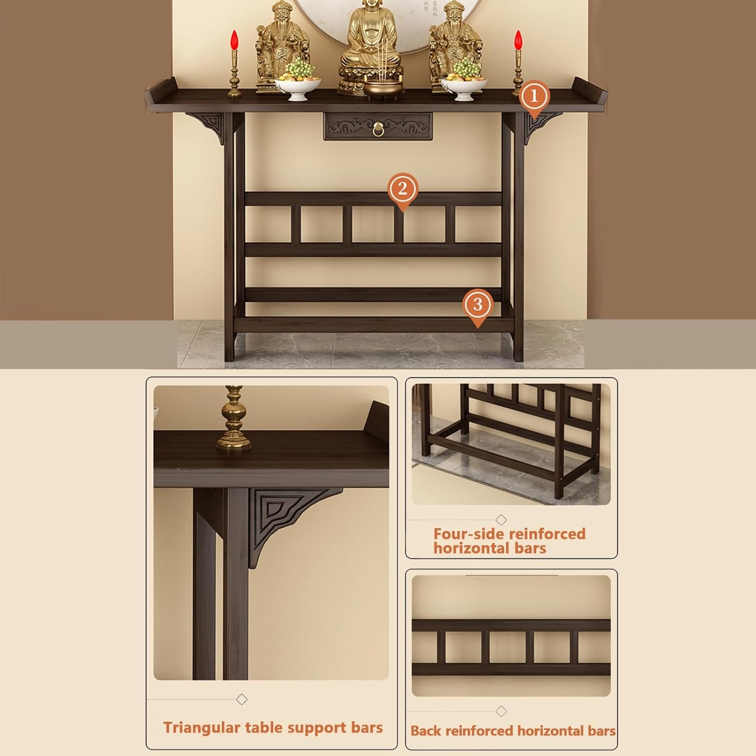 YUGXTH Zen-inspired offering table cleverly blends practicality and beauty, designed for those who seek quality and artistic conception. Its vibrant auspicious cloud pattern not only adds a touch of rustic elegance to the tabletop, but also provides strong structural reinforcement, ensuring stability.Buddhist altar is not just a display piece; it’s a dedicated offering and incense table that allows you to honor your spiritual traditions beautifullySpecifications:Product Name: Chinese God of Wealth Altar Table, Meditation Table Altar with Storage, Multi-Level Personal Shrine Puja Table for Spirituality, Wood Altar Cabinet for Witches, Wiccan Buddhist Shrines, Prayer Stand RiserMaterial: BambooColor: BrownLength: 80cm/31.5in, 100cm/39.3in, 120cm/47.2inWidth: 29cm/11.4inHeight: 81cm/31.9inApplication: Suitable for ancestral halls, temples, rituals, offerings, incense burning, divination, and other ceremoniesProduct Contents: 1 * Chinese God of Wealth Altar TableNote: Due to manual measurement, there may be discrepancies of 0-3cm. Please confirm the dimensions before purchasing.Images are for reference only; other items are not included.Colors may vary slightly due to monitor differences.