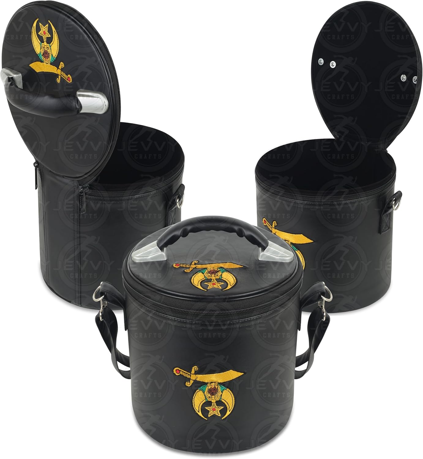 This Masonic Shriner Embroidered Fez Case is designed to provide secure storage and organized transport for ceremonial fez hats. The case features a rigid internal structure that helps maintain its shape, offering reliable protection for the fez during lodge meetings, ceremonies, or travel. The exterior is crafted from premium black faux leather and finished with a Shriner embroidered emblem on both the front panel and the top lid, creating a clean and traditional presentation. Inside, the case is lined with soft black velvet, which helps cushion the fez and reduce the risk of scuffs or fabric wear. Measuring approximately 9 × 9 × 8 inches and weighing around 700–800 grams, this single-compartment case comfortably fits standard fez hats. A smooth zipper closure allows easy access, while the reinforced top carry handle provides convenient hand transport. For added versatility, the case includes a detachable and adjustable faux leather shoulder strap with silver-tone metal hooks and an adjustable center buckle, offering hands-free carrying when needed. Designed for Shriner and Masonic use, this case combines protection, practicality, and a professional appearance suitable for regular ceremonial use.