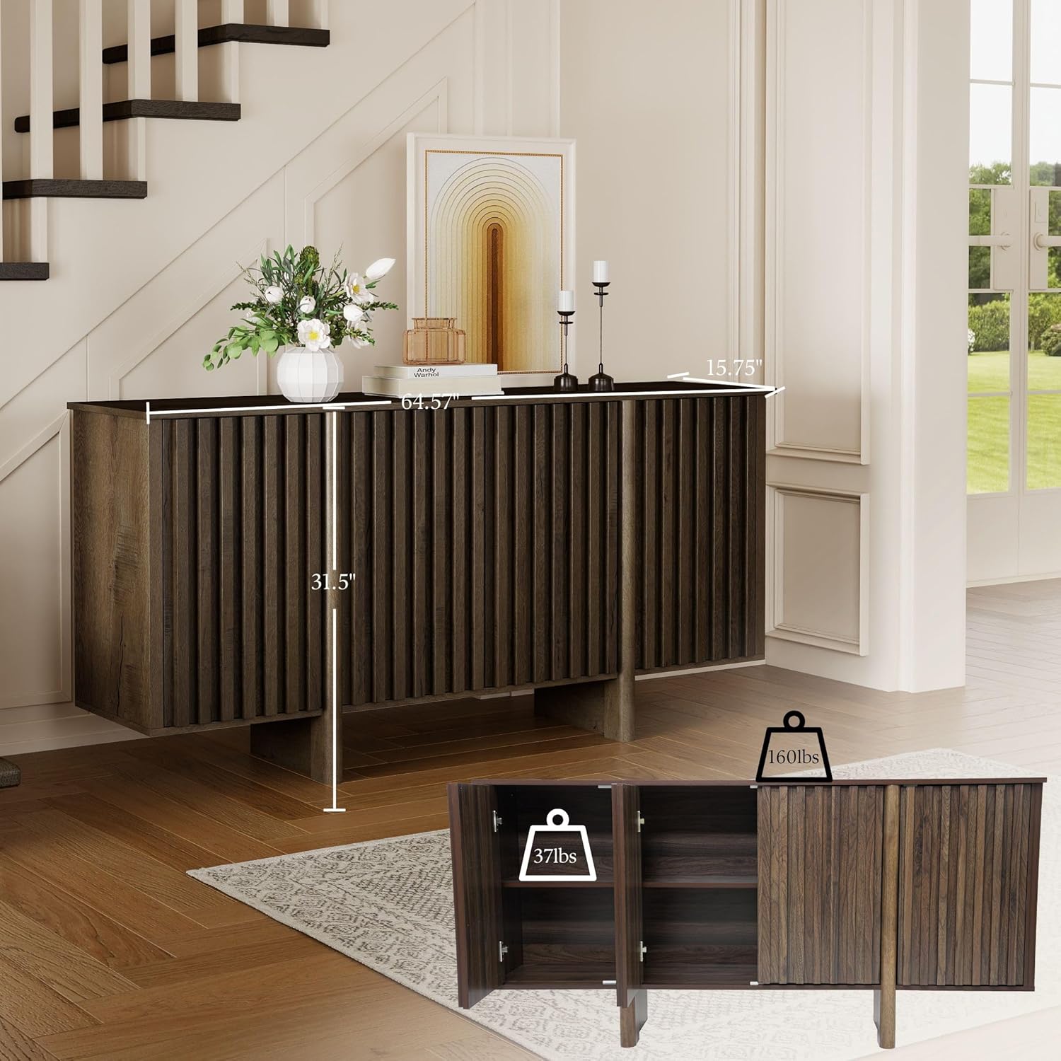 Maximize both style and storage with this spacious 64-inch farmhouse sideboard, thoughtfully designed to meet the demands of daily life. In the dining room, it serves as a practical buffet for holiday feasts—store serving platters, linens, and flatware inside while using the sturdy top as a serving station for dinner parties. In the living room, it transforms into a sleek media console, perfectly sized to hold your TV, soundbar, and gaming consoles, with ample hidden space behind the doors for remotes, cords, and DVDs. In a narrow hallway or entryway, it acts as a smart organizational hub—keep outdoor essentials neatly tucked away while displaying a lamp, basket, or family photo on top. Whether used as a credenza, coffee bar base, or command center, its generous length and natural wood finish bring function, warmth, and timeless charm to any room.