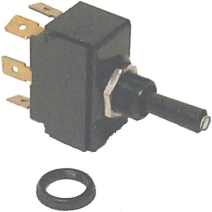 The Sierra TG40300 Tip-Lit Toggle Switch features a non-corrosive plastic construction, brass blade terminals and silver contacts. Illuminates white when the panel lights are on, changes to red when switch is on.