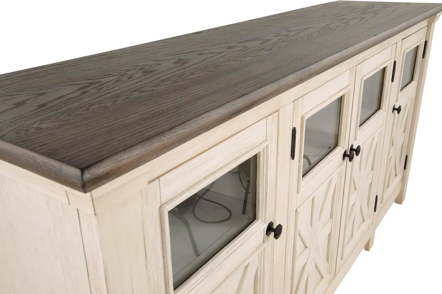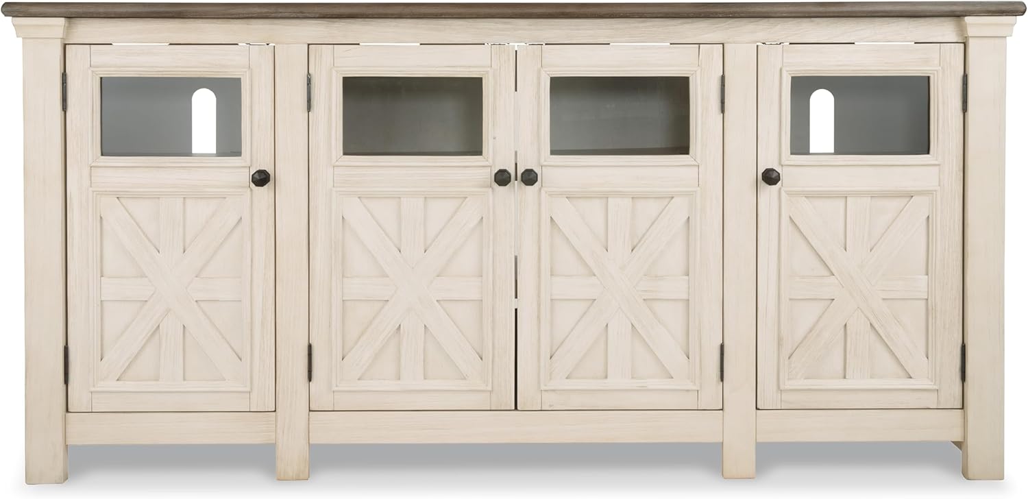 The Bolanburg Extra Large TV Stand blends farmhouse charm with practical storage. Its two-tone finish pairs weathered oak and antiqued white for a cozy, cottage-inspired look. Featuring crossbuck cabinet doors with glass inlays, adjustable shelves, and wire management cutouts, this stand keeps your media organized while adding character to your living space. Ideal for rustic or shabby chic interiors.