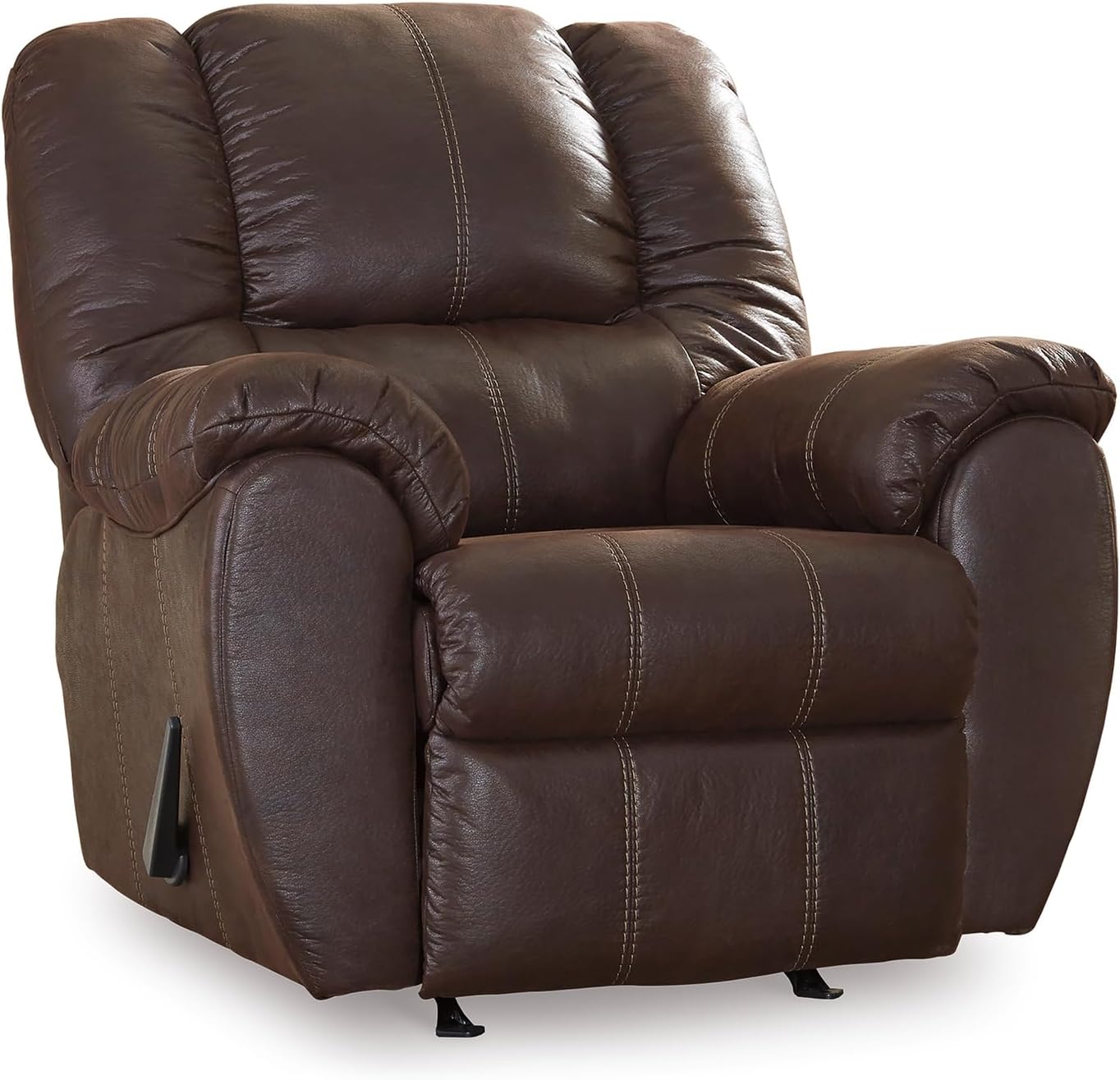 Rock the cool look of leather and the warm feel of fabric with the McGann rocker recliner. Sporting sumptuously thick cushioning, fashion-forward jumbo stitching and a richly tailored aesthetic, this smartly priced recliner with gentle rocking motion is a bestseller for good reason.