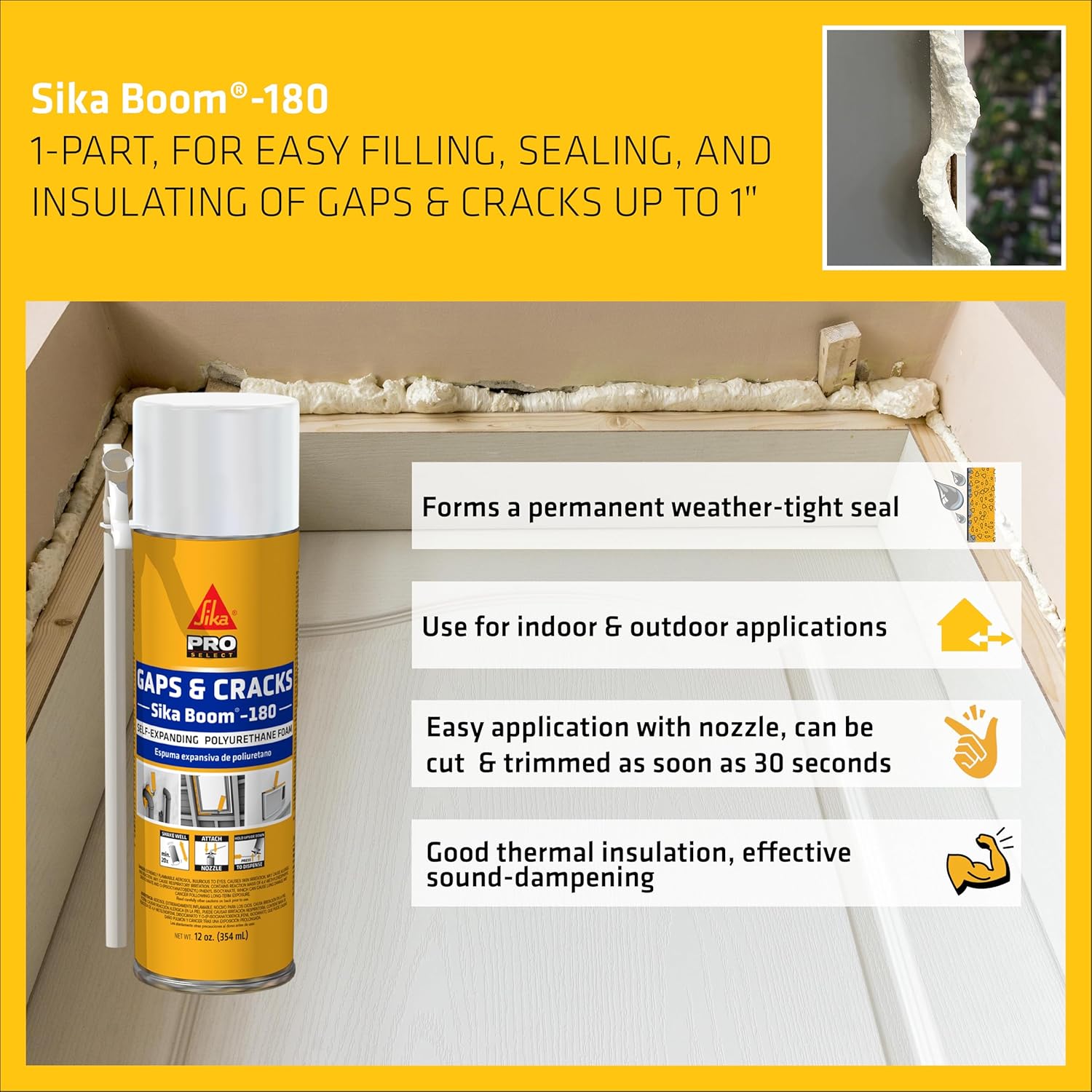 Sika Boom-180 is a polyurethane, 1-part, self-expanding foam made for easy application for general purposes up to 1''. Ideal for filling gaps and cracks and for insulating against noise, cold and draughts. Designed for interior and exterior applications.