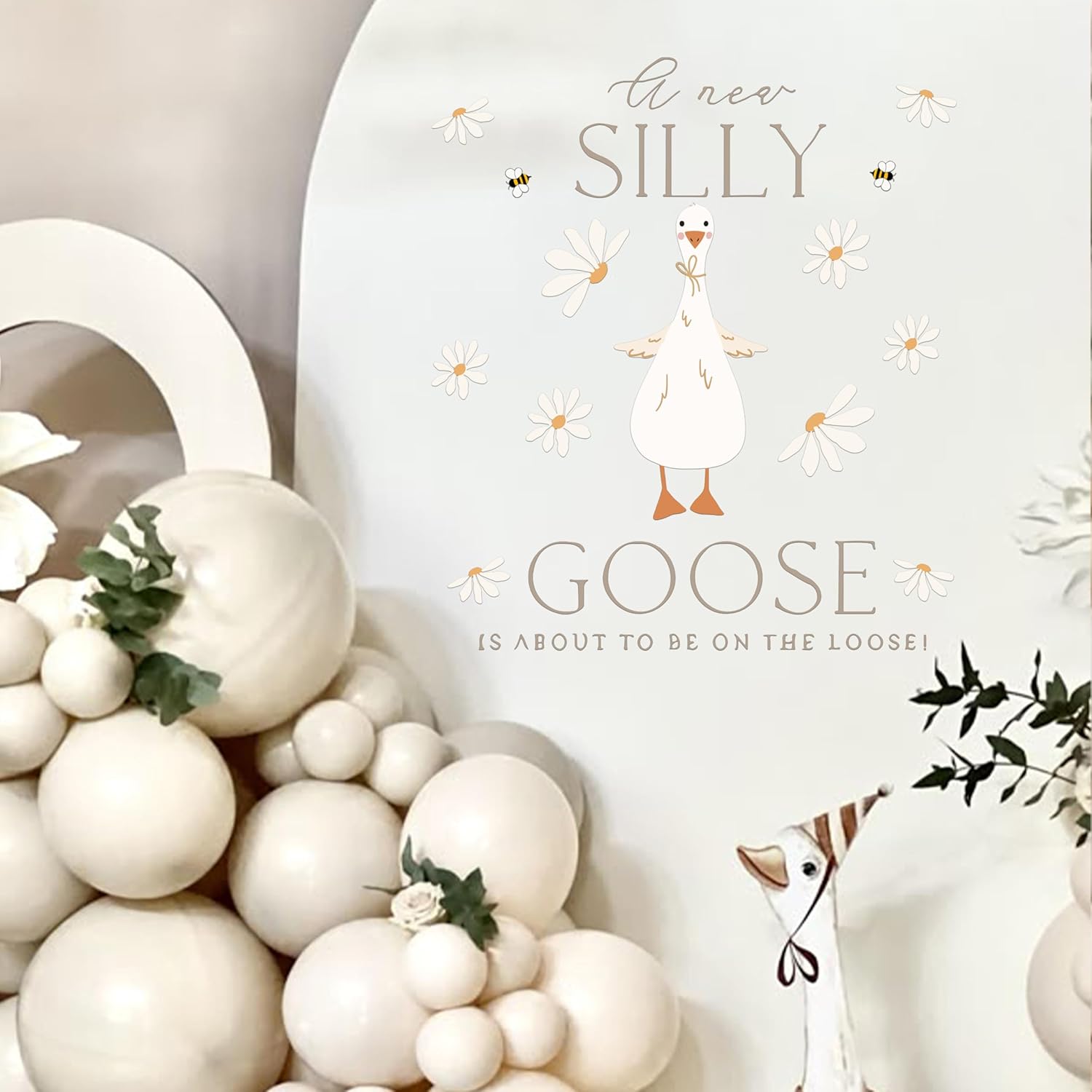 Add a whimsical touch to your celebration with this charming Silly Goose wall decal, perfect for baby showers and birthday party decorations. Measuring 22x28 inches, this delightful design features an adorable white goose surrounded by dainty daisies and playful bumblebees, complemented by elegant text in sophisticated gold tones. The decal's clean, modern aesthetic works beautifully as a backdrop for balloon arches or as a standalone statement piece on any smooth surface. The design captures a perfect balance of sweetness and style with its playful tagline 'A New Silly Goose is About to Be on the Loose!' Each pack includes one decal that's sized generously to create maximum impact at your special event. The decal is designed for easy application and removal, making party setup and cleanup hassle-free. Create memorable photo opportunities and enhance your party space with this versatile decorative element that adds just the right touch of whimsy to your celebration.