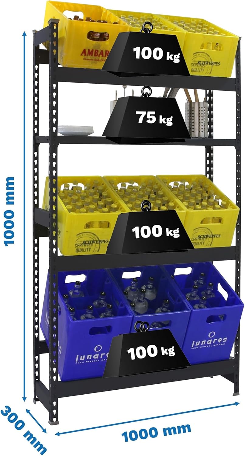 Large storage space - Shelf 1000 x 1000 x 300 mm for 9 drinks crates. HEAVY DUTY STEEL CONSTRUCTION - Supports up to 100kg bend per height. Weight certified. Independent Assembly - Each tier can be mounted freely. Delivered disassembled - video assembly instructions step by step and updated instructions. Made in Europe - With extended warranty of 5 years.