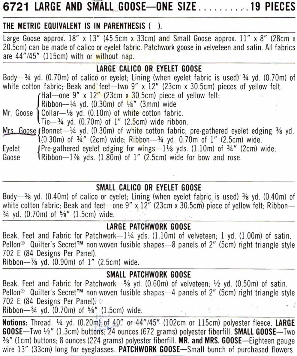 Simplicity 6721 Crafts Sewing Pattern Large and Small Goose: Large Goose approx. 18 inches x 13 inches (45.5cm x 33cm) and Small Goose 11 inches x 7 inches (28cm x 20.5cm) can be made of calico or eyelet fabric. Patchwork goose in velveteen and satin. All fabric are 44 inch /45 inch (115cm) with or without nap.