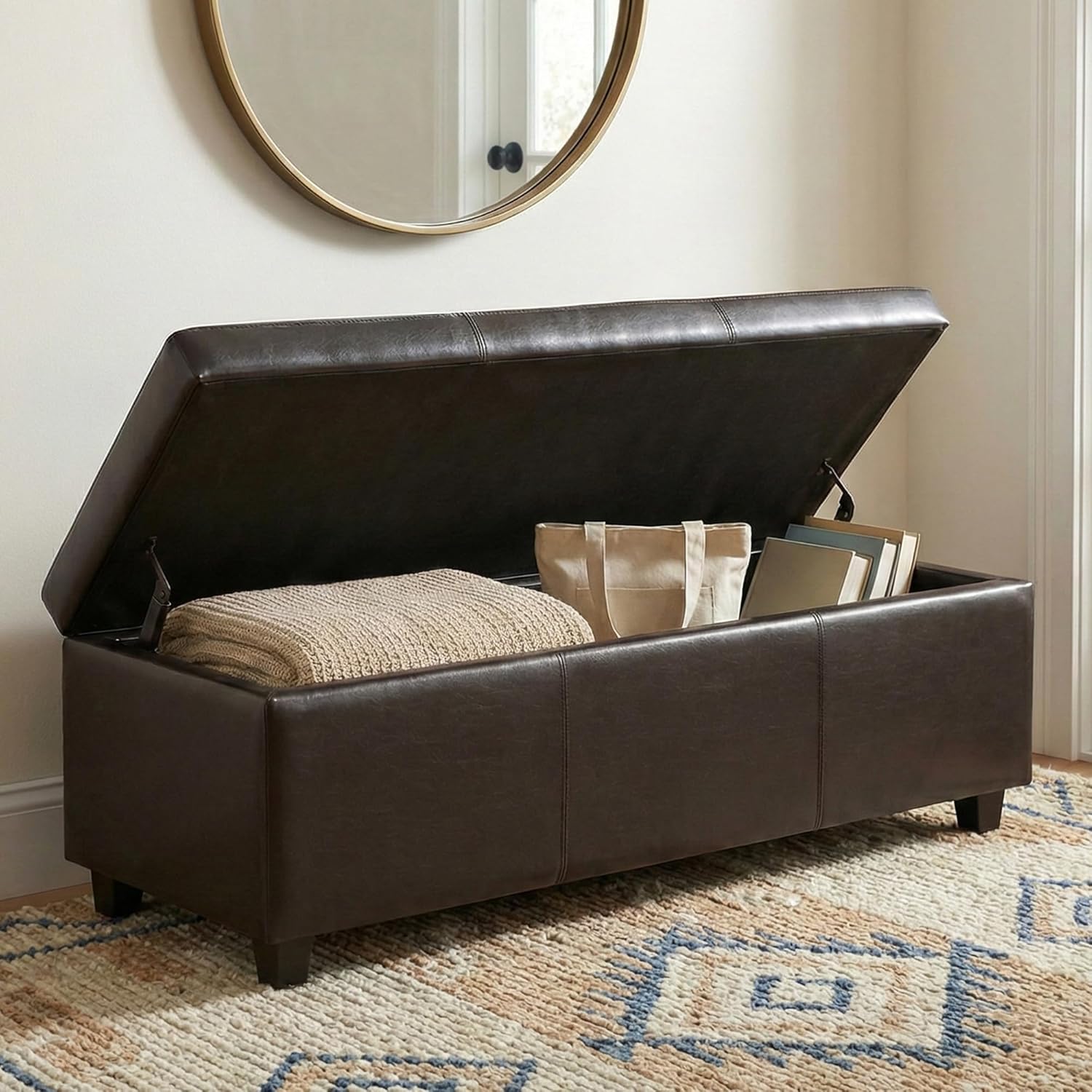 SIMPLIHOME Avalon Storage Ottoman Bench - 48 inch Wide Upholstered Vegan Leather Rectangular Lift-Top Ottoman in Tanners Brown, Contemporary Storage Bench for Living Room with High-Density Foam