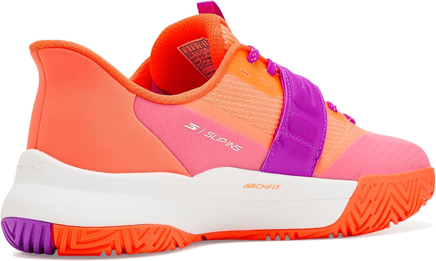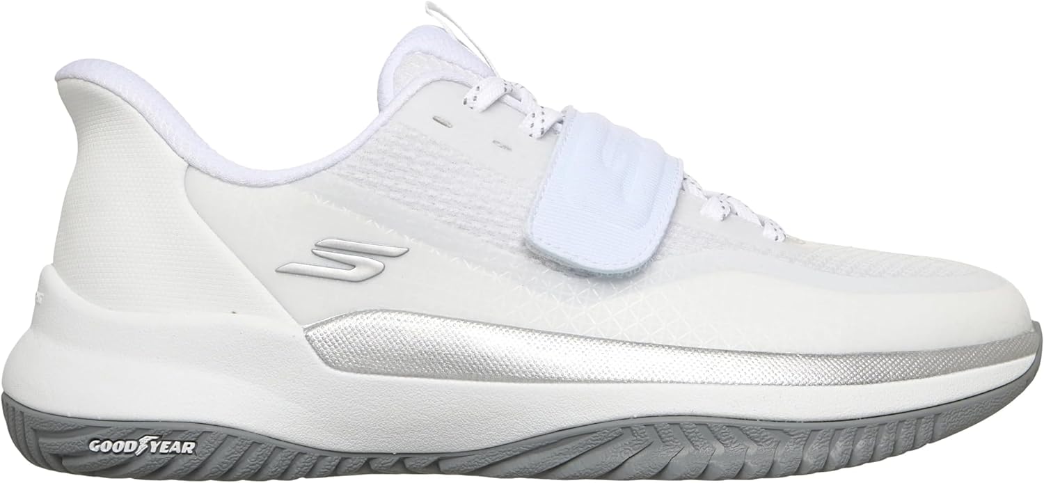 Feel the advantage in every game with Skechers Hands Free Slip-ins® Relaxed Fit®: Viper Court Elite - 2.0. Designed with our Heel Pillow®, this roomy slip-on is created specifically for the competitive pickleball athlete and features an athletic mesh and TPU overlay upper with adjustable laces, an adjustable top strap for enhanced lockdown, a removable Arch Fit® insole, and lightweight ECO FLIGHT™ midsole cushioning. The design is complete with a Goodyear® gold compound non-marking outsole built for increased durability and controlled slides on the pickleball court surface.