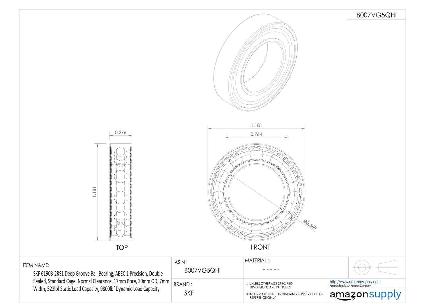 The SKF deep groove ball bearing is a double-sealed ball bearing with Annular Bearing Engineering Committee (ABEC) 1 precision and normal clearance. This ball bearing has a deep-groove geometry for high speeds and supporting both radial and axial loads. This bearing conforms to the precision standard ABEC 1 for performance within a narrow range of variation and has normal radial clearance for applications that do not involve thermal expansion or atypical precision. The standard cage evenly spaces the balls for even load distribution and prevents contact to reduce friction, vibrations, and noise. Seals on both sides of the bearing fasten to the outside ring and extend over the rolling elements to make contact with the inside ring, keeping out contaminants such as dirt and grime. The seals also hold in a high-quality lubricant applied at manufacture that will last the entire lifetime of the bearing, making it maintenance free. This deep groove ball bearing is for use in applications that involve combined radial and axial loads and a need for high running accuracy and stiffness at high rotational speeds. Such applications include clutches, drives, gearboxes, compressors, pumps, turbines, and printing and textile machines, among others.Rolling bearings use rolling elements to maintain the separation between moving parts to reduce rotational friction and support radial and axial loads. These elements can be one of the following types: ball, cylindrical, spherical, barrel, needle, spindle, or tapered. All rolling bearings are open, shielded, or sealed. Sealed bearings are lubricated with oil or grease in the bearing factory, while open and shielded bearings are meant to be lubricated in place, with periodic reapplication of lubrication, based on use. The shield protects the working parts of the bearing from environmental debris that may be introduced and could reduce the ball bearing speed and lifespan. Rolling bearings are used in a range of applications from agricultural machinery to conveying equipment, robotics, dental equipment, elevators, rolling mills, ship rudder shafts, and aggregate crushers, among others.SKF Group manufactures bearings and units, seals, mechatronics, and lubrication systems that meet International Organization for Standardization (ISO) 14001 and 9001, and Occupational Health and Safety Assessment Series (OHSAS) 18001 standards for quality assurance. The company, founded in 1907, is headquartered in Göteborg, Sweden.