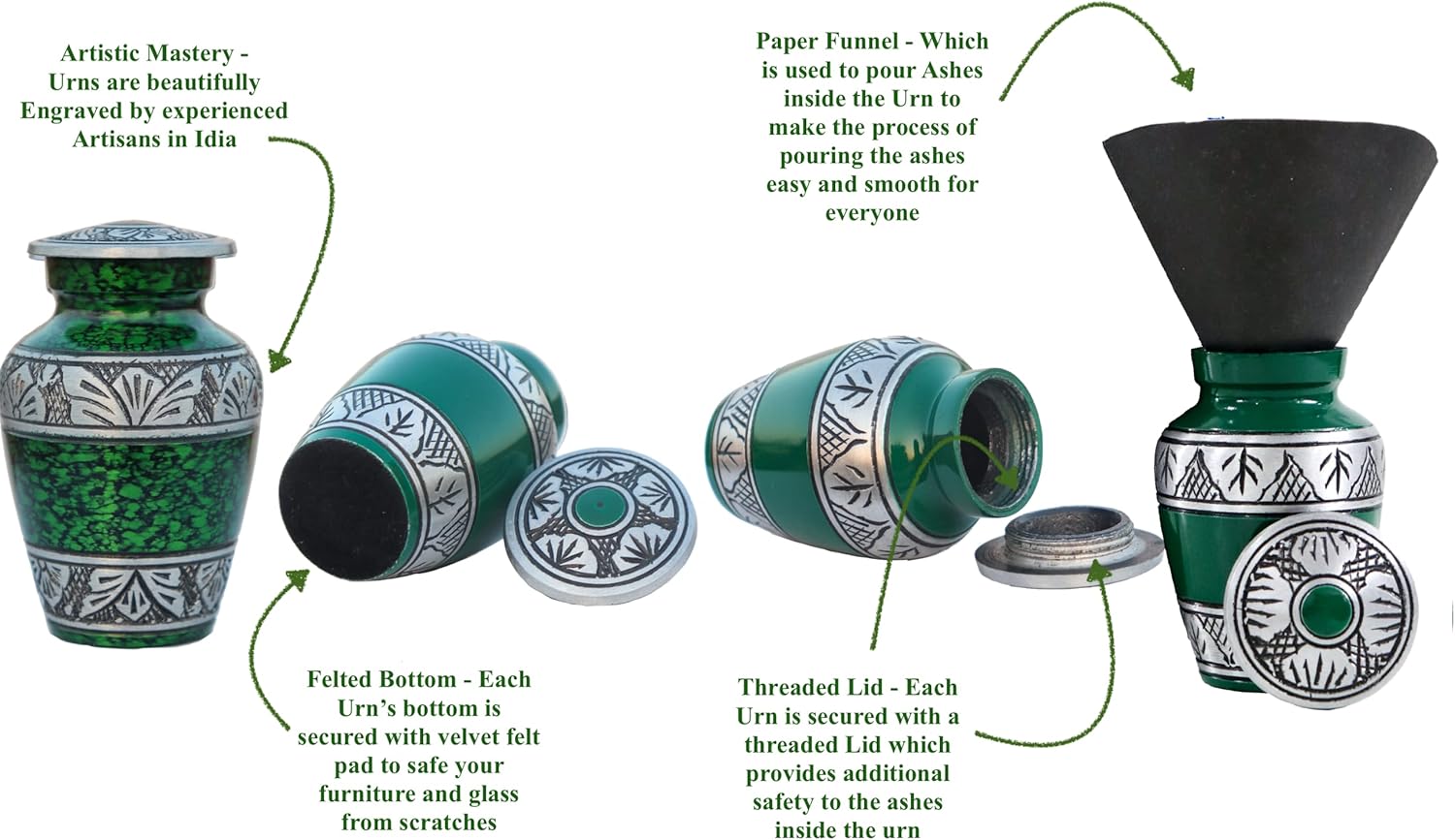 | Included Components | 4 Drawstring Velvet Carry Bags, 4 Pieces of Small Keepsake Urns For Human Remains, Beautiful Magnet Closure Gift Box, Paper Funnel to pour Ashes inside the Urn |