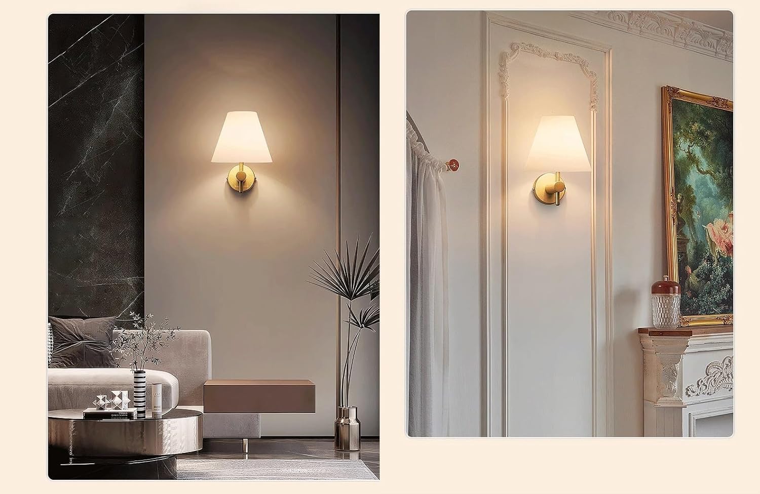 Durable Premium Material: Our set of two wall sconces features an elegant column stand arm and white fabric shade, made from high-quality materials that won't easily oxidize or fade. The soft glow of the light protects your eyes and creates a warm, relaxing atmosphere.Retro Industrial Design: The simple yet stylish design of these sconce wall lighting makes them a perfect match for any decor style. Use them as bedroom reading lights, night lights, or decorative accents in your living room, office, bathroom, or hallway.Easy to Install: The pair of wall lights come with all the mounting hardware required for install and installation is a Breeze! Only takes you a few minutes to finish.Specifications.Irradiation area: 3㎡-6㎡ Color: antique Brass Bulb type: E26/E27 USB Rechargeable Light bulbLumen: 150lmBulb average life: 30000HColour temperature: 3000K warm light, 6000K white lightMaterial: Brass and fabric shadePacking list:Small fabric shade wall sconcewireless Battery Operated Light bulb with remote control(The remote control uses 2xAAA batteries)