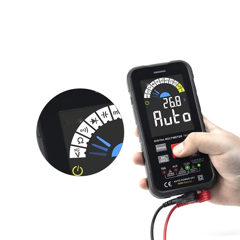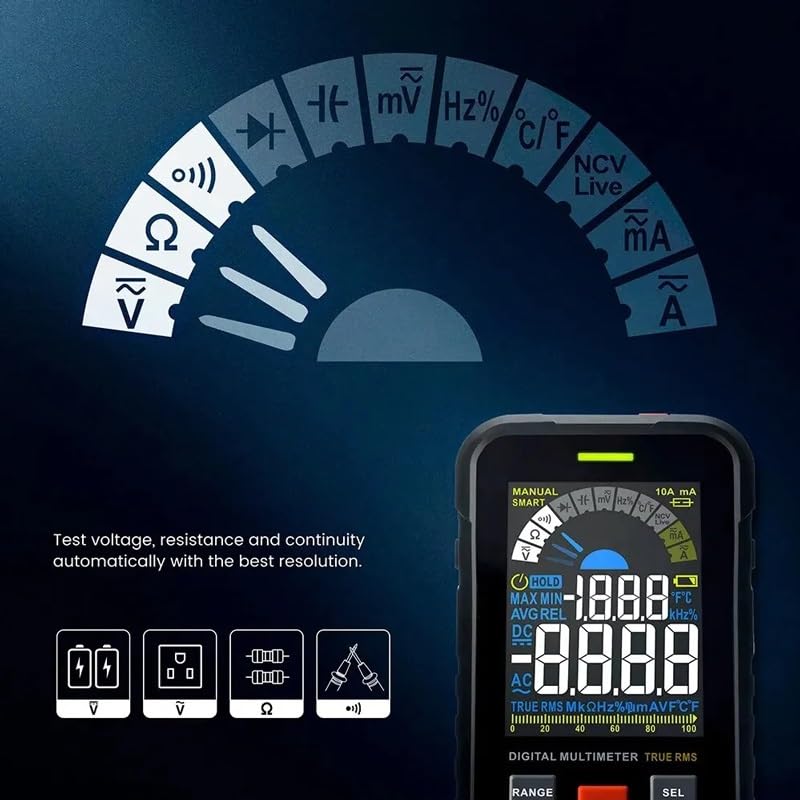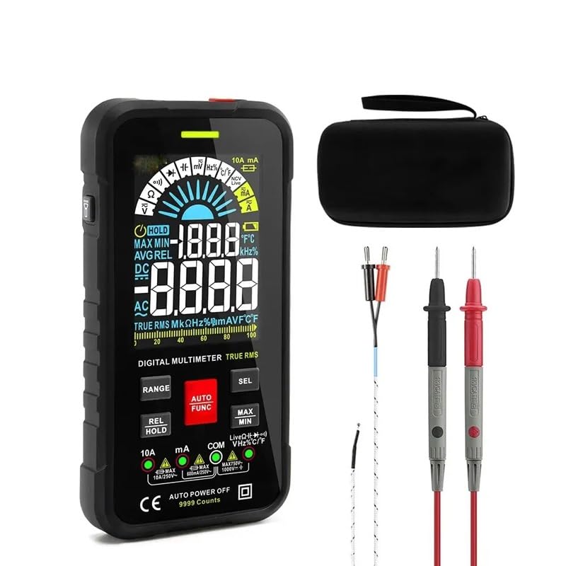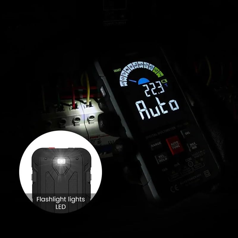 According to the difference between voltage and resistance, operator do not need to turn the dial to select the function, because of its automatic identification measurement.The stable performance, high precision, high reliability, clear reading, overload protection function are achieved.and with large screen LCD display, beautiful backlight making the display clear, convenience, it is cherished .This type of meter also automaticaly identify voltage, Ac voltage, resistance, continuity, without any selection,besides with the function manually switching to measure electric field induction and fireline discriminationit will be an tool for radio enthusiasts and families, thanks to its superior performance.Item Weight:0.625 KGProduct Dimensions:20.5cm X 11.2cm X 6cmBatteries:3 AAA batteries required (not included)Performance Description:2 colors LCD screen, true RMSUsageVoltage tester▲ Large range measuring tool▲ Frequency multimeter▲ Diode electronic tester▲ Capacitance digital meterΑ Ohm meterUpgraded Specification● Voltage: 99.99mV/999.9mV; 9.999V/99.9V/1000V ±(0.5% + 3)● AC Voltage: 99.9mV/999.9/mV; 9.999V/99.9V/750V ±(0.8% + 3)● Current: 9.999mA/99.99mA/999.9mA ±(0.8%+3);9.99A ±(1.2%+3)● AC Current: 9.999mA/99.99mA/999.9mA ±(1.0%+3);9.99A ±(1.5%+3)● Resistance: 999.9ohm/9.999k/99.99k/999.9kohm ±(0.8%+3);9.999m/99.99mOhm ±(1.2%+3)● Capacitance: 9.999/99.99/999.9nF/9.999/99.99/999.9uF ±(4.0%+3);9.999mF/99.99mF ±(5.0%+5)● Frequency: 99.99/999.9/9.999k/99.99k/999.9kHz/9.999mHz ±(1.0%+3)● Duty: 01.%-99.99% ±(1.0%+2)Package contents:1 x km601multimeter1 x Test Leads1 x User Manual1 x thermometer couple1 x EVABag(not including other display items)1. Due to measurement, please allow an error of 1-3 cm.2. Due to different computer screens and monitors, the actual color may be slightly different from the picture.Thank you for your understanding!High-definition backlight display: high-definition backlight easy to deal