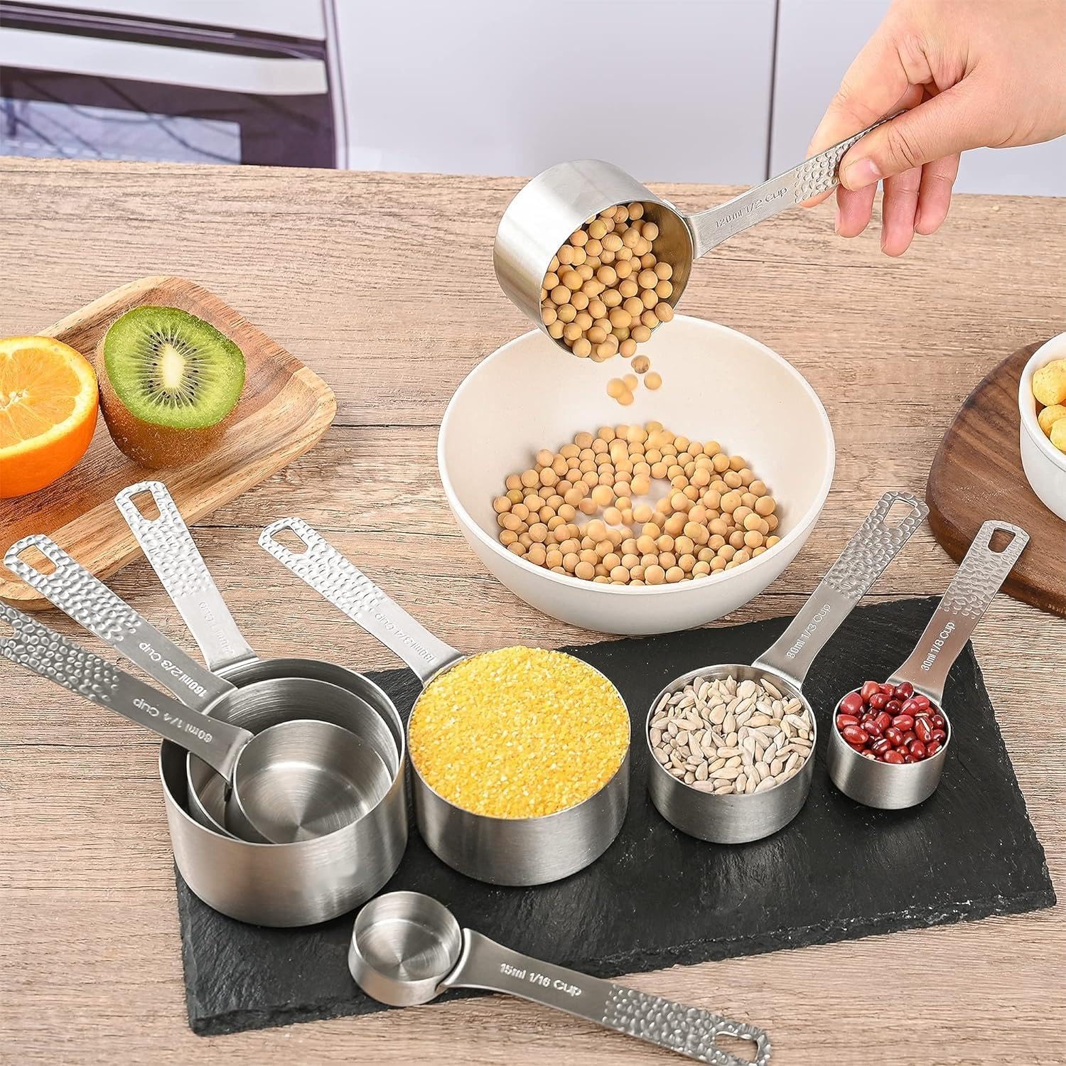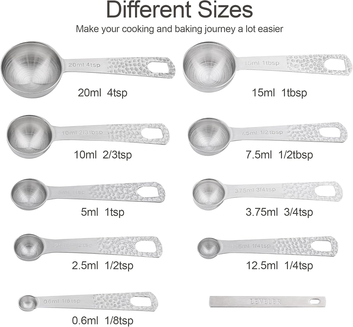 Smithcraft 18/8 (304) stainless steel measuring cups and measuring Spoons set :1.Engraved Measurement Markings - do not fade, wash off or wear out like printed ones 2.Materials: Stainless Steel 304 (18/8) - Rust Proof 3.Round shape to easily stack them into each other for easy storage4.Sturdy Locking Rings to Hold corresponding pieces together. 8 MEASURING CUPS SIZES:1 CUP - 240ML 3/4 CUP - 180ML 2/3 CUP - 160ML 1/2 CUP - 120ML 1/3 CUP - 80ML 1/4 CUP - 60ML 1/8 CUP - 30ML1/16 CUP - 15ML 9 MEASURING SPOONS SET SIZES: 4 TSP - 20 ML 1 TBSP - 15ML 2/3 TBSP - 10ML1/2 TBSP - 7.5 ML 1 TSP - 5 ML 3/4 TSP - 3.75 ML 1/2 TSP - 2.5 ML 1/4 TSP - 1.25 ML 1/8 TSP - 0.6 MLSet Indclude:8 x measuring cups9 x measuring Spoons1 x Measruing Leveler 2 x Locking RingsCustomer Satisfaction: If there is anything that you are not satisfied with our item or services, please contact us freely, we always reply in 24hrs, and we promise to offer our best services for you.