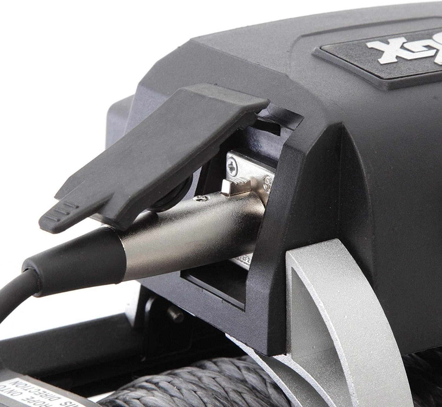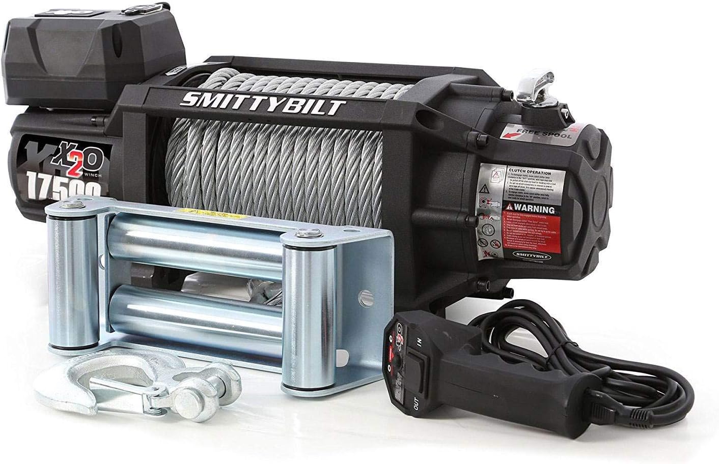 Smittybilt 97517 winch has an IP68 waterproof rating, rated line pull of 17,500 pounds (7,954 kilograms) in a single line. Motor of 6.6hp series wound, the remote switch reaches 12 feet (3.7m) lead. The gear train is of revolutionary 3-stage planetary. Gear ratio is of 430:1, clutch: sliding ring gear, brake: automatic out-of-drum. Drum size: Diameter 3.45 inch, cable: 98.5 feet 3/8 inch diameter, cable type: braided steel wire rope, fairlead: 4-way roller. Recommended battery: 650CCA minimum for winching, battery leads: 25 square millimeter, 72 inch (1.83m). Finish: textured black. Weight: 132.2 pounds (59 kilograms); mounting bolt pattern: 10.0 inch x 4.50 inch, overall dimensions: 22.3"L x 7.5" W x 10.7"H.