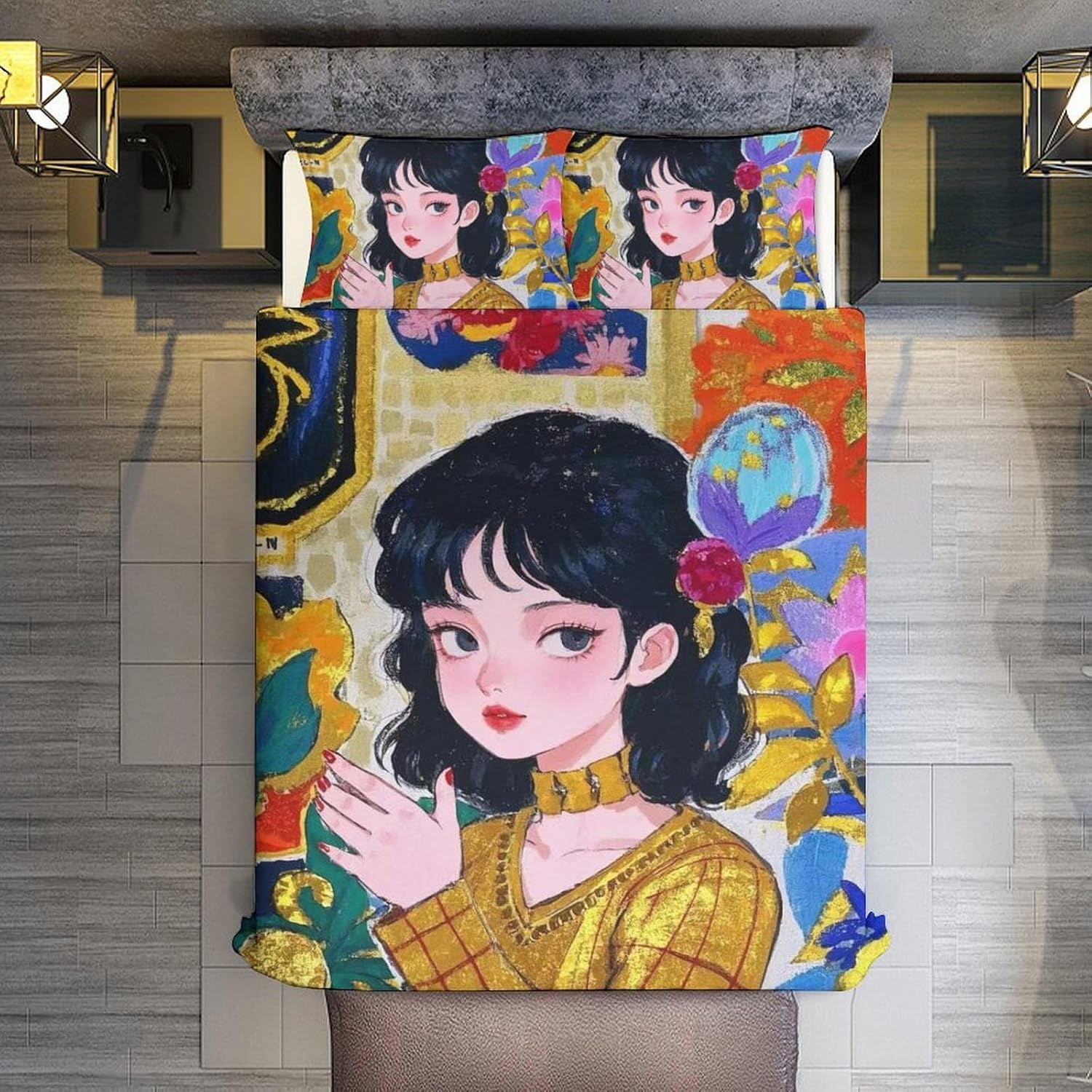 This The Girl in Yellow king size comforter set is designed to enhance your sleep quality. Made from select microfiber fabric, it's lightweight, soft, and highly breathable, ensuring a comfortable and restful night's sleep. The set includes pillowcases, sheets, and a duvet cover, fully meeting your everyday bedding needsThe stylish single-sided heat transfer pattern on this confort Bed Sheet set queen combines comfort and aesthetics, with vibrant colors to create a warm and inviting atmosphere for your cozy home, stylish hotel, themed room, or comfortable vacation homeExquisite craftsmanship showcases superior quality, with fine stitching and a concealed metal zipper reflecting meticulous attention to detail. The microfiber fabric not only boasts excellent pilling resistance and colorfastness but also won't shrink or fade even after high-temperature treatment, ensuring durability. The thickened design enhances the feel and warmth, and the fabric is easy to clean, hand-washing or machine-washing at room temperature without bleaching