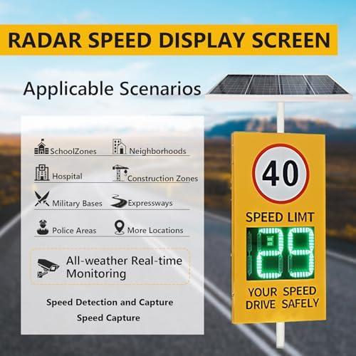 Enhance road safety with our Solar-Powered Radar Speed Sign, designed for highways, residential areas, schools, and speed-sensitive zones. This innovative sign features a durable rust-resistant aluminum construction and a high-brightness LED digital display, ensuring visibility day and night. By detecting and showcasing vehicle speeds in real-time, it encourages drivers to reduce their speed, contributing to a safer driving environment. Product Highlights: - **Durable Design**: Constructed from aluminum alloy with engineering-grade reflective film, this speed sign is built to withstand various weather conditions. - **High Visibility**: The LED display is designed for clear visibility from over 500 meters, making it effective in alerting drivers well in advance. - **Solar-Powered Efficiency**: Equipped with a solar panel, this speed sign operates independently, reducing energy costs and ensuring continuous performance. - **Weather Resistant**: With an IP65 waterproof rating, it is protected against dust and water, making it suitable for outdoor use all year round. - **Long Lifespan**: Designed for longevity, the sign boasts a lifespan exceeding 100,000 hours, minimizing the need for frequent replacements. Installation Tips: 1. Position the sign in a location with an unobstructed view, avoiding direct sunlight on the display. 2. Test the LED functionality before installation by covering the solar panel to simulate night conditions. 3. Adjust the solar panel angle for optimal sunlight exposure throughout the day. Package Includes: - 1 Solar Panel - 1 Speed Sign - 1 Set of Accessories Please note: Manual measurements may vary slightly, and actual product colors may differ from those displayed on your screen. Improve your community's road safety with this effective and reliable speed sign today!