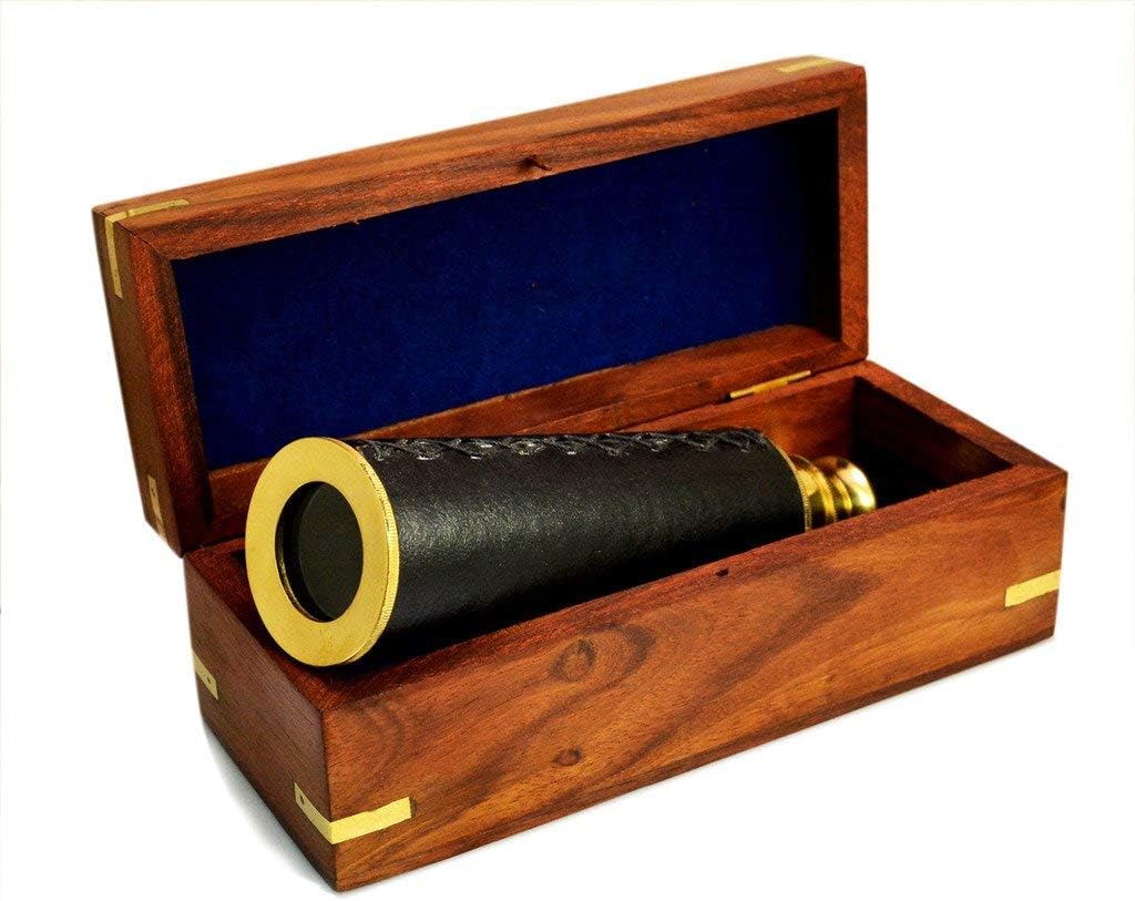 Solid Brass/Leather Admiral Spyglass Nautical Spyglass 14 Inches Golden A hard wood box is included for carrying and display. Traditional international style Solid brass telescope Decorative telescope True art of india