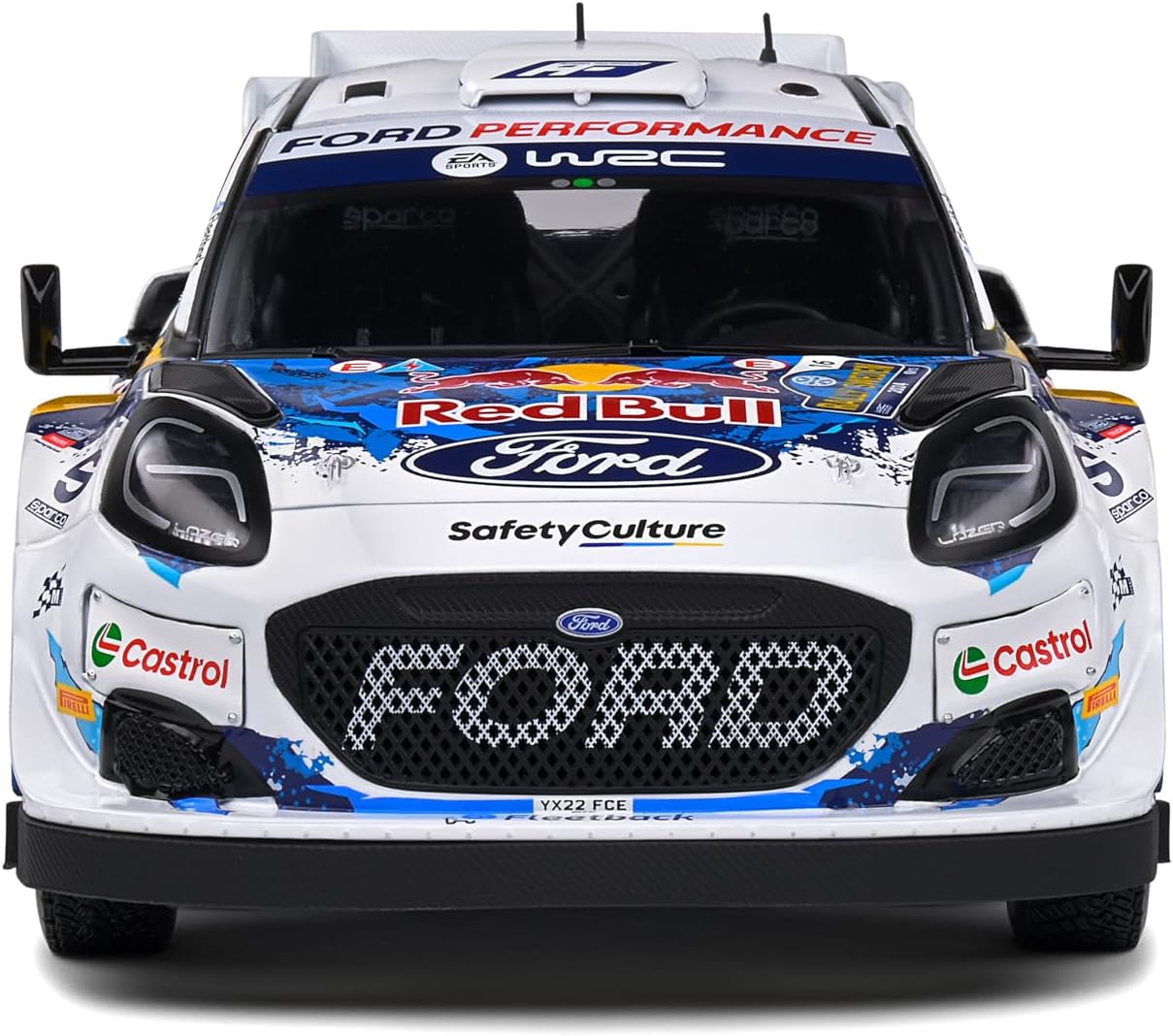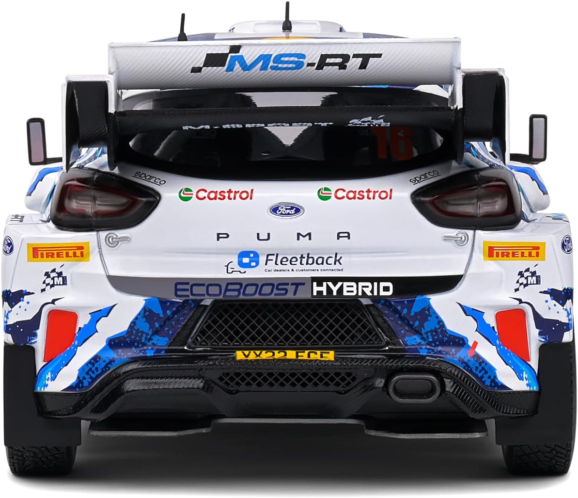 The Solido 1:18 scale Ford Puma Rally1 diecast model recreates the rally car driven by Adrien Fourmaux and Alexandre Coria during Rally Sweden 2024. Officially licensed by Ford, this collectible replica features the white #16 rally livery associated with the World Rally Championship event. Measuring approximately 9 inches in length, the model includes opening front doors that reveal interior cockpit detailing. Constructed with a diecast metal body and plastic components, this display model is intended for collectors aged 14 and above.