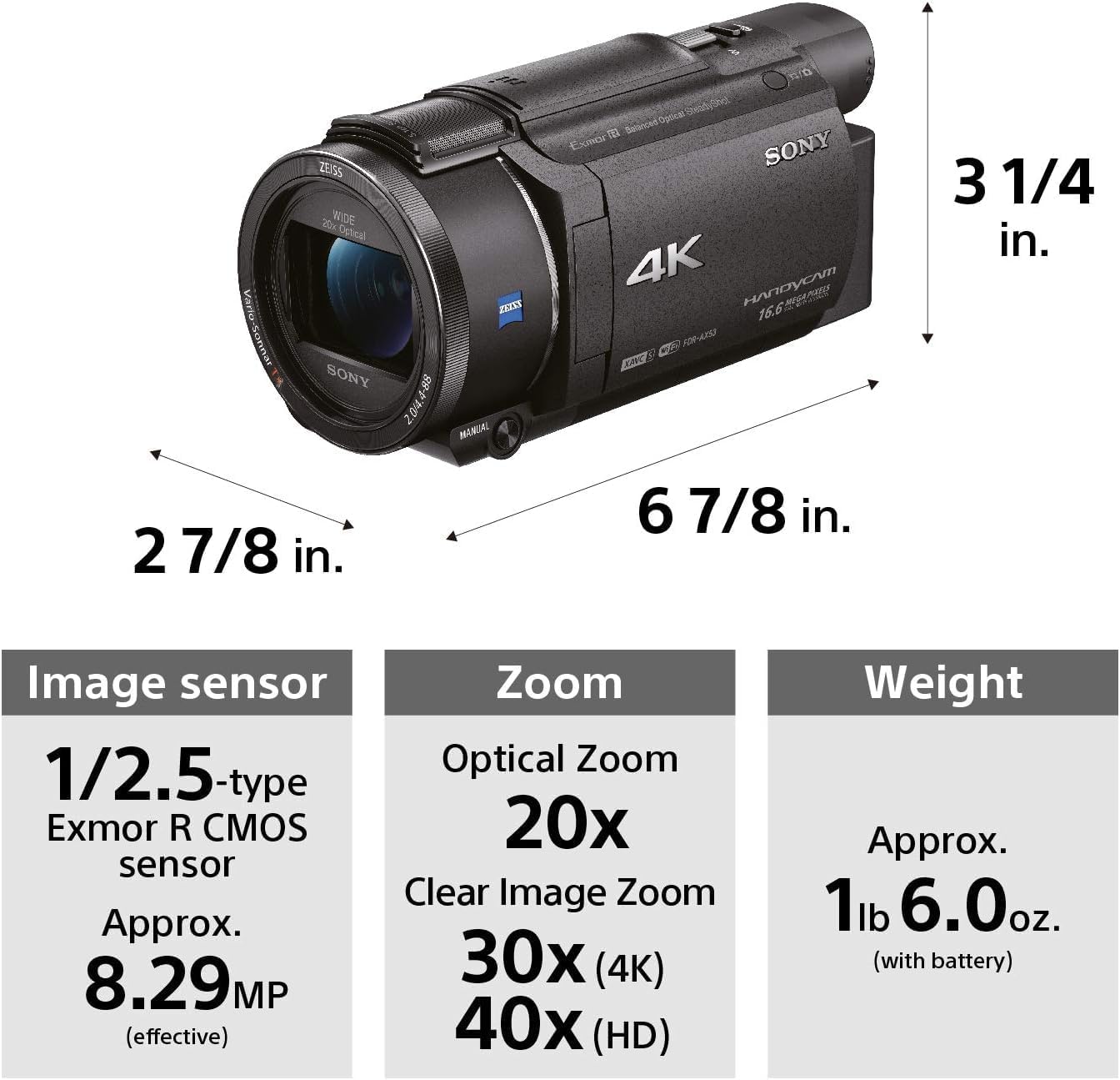 4K XAVC-S recording with 16. 6MP, Exmor R sensor, B. O. SS stabilization ZEISS lens(26. 8mm) 20x optical zoom in 4K, 30x Clear Image Zoom in 4K3. 0" LCD (Touch panel), EVF, Wi-Fi/NFC, manual ring, night shot, 4K Time-lapse capture Built-in Zoom Microphone. Note-at a higher gain, the brightness becomes more appropriate in dim scenes, but the noise increases. At a lower gain, the noise decreases, but the shutter speed becomes slower to compensate for the lack of brightness, causing camera shake or subject blur