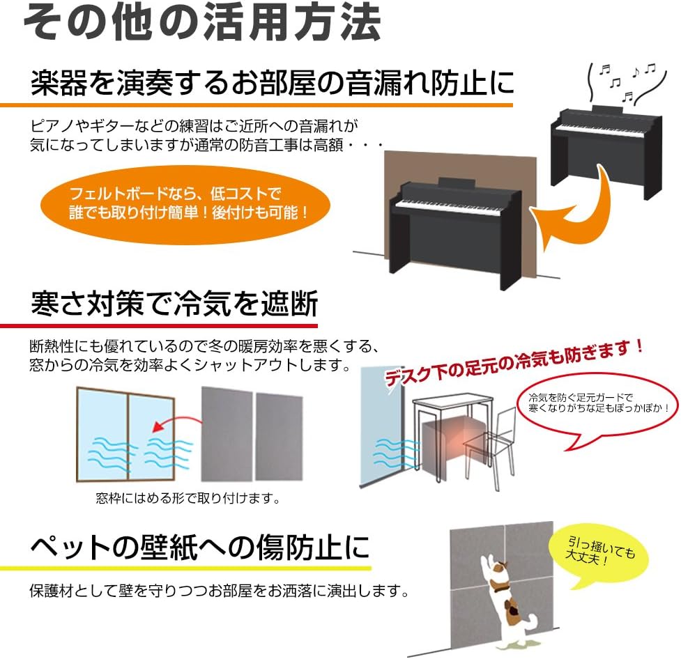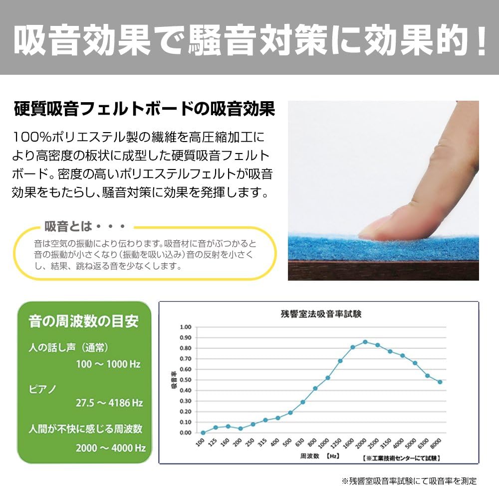 A new generation of material that creates new value in your life. ◆ Felmenon Hard Sound Absorbing Felt Board made of 100% polyester fiber and molded into a high-density board with high compression processing. With excellent sound absorption and a wide variety of colors, it can be used in a variety of scenes and products. Hard sound absorbing felt board sound absorbing effect The dense polyester felt has a high sound absorbing effect and absorbs noise in the room. Use on walls and floors to prevent noise What is sound absorption? Sound is transmitted through vibrations in the air. When the sound hits the sound absorbing material, the sound vibration will be reduced (sucking in vibration), reducing the reflections of the sound and reducing the amount of bouncing. 7 Features of Fermenon 1. Sound Absorption: The hard sound absorbing felt board is made of 100% polyester fiber and is molded into high density board by high compression processing. Absorbs sound energy in the room and reduces sound reverberation. Please refer to the product images for sound absorption rates. (*Measures sound absorption rate through the reverberation chamber sound absorption rate test.) 2. Safe and Secure: The felt board is produced without glue, and is a low formaldehyde that does not emit formaldehyde. The adhesive used for the product is also F (standard) so it is safe even in living environments with children. There is no bad smell in the future of your petroleum products. (*JIS A 6912 within 0.05 mg/L of F☆☆☆☆☆Standard) 3. Dyeing fastness: As a result of professional institutes, light fastness test: grade 4 and above / Friction test: rating 4 - 5 (dry and wet) and has high color fastness rating. There is no need to worry about fading due to exposure to sunlight or friction during use (*tested based on JIS L1096A) 4. Breathability: The average breathability value is 50 cm3 / cm2 / S (*The amount of air passes through 1 second). Breathability: Compared to standard carpets, it has a high level of breathability compared to the average 30 cm3 / cm2 and S. (*Test based on JIS L 0842 / JIS L 0849 II model) 5. Flame Retardant: The fiber dense felt board is highly flame retardant and meets the international standard ASTME84-08 and the Department of Duty Fire Retardant Test method. (45° Air Mix Burner Act) 6. Strong and Abrasion Resistant: The material is strong and durable as a polyester fiber. Abrasion resistance testing shows that dimension change rate is about 1.2% and surface strength is almost no visible changes in appearance. (*Test based on JIS L 1096C law) 7. Processing: It can be easily cut with a blade such as a cutter, so it can be processed to fit the size you need, such as indoor walls, pillars, floors, etc. In addition, there are various processing methods such as 3D embossing, die-cutting, laser cutting, and gluing.