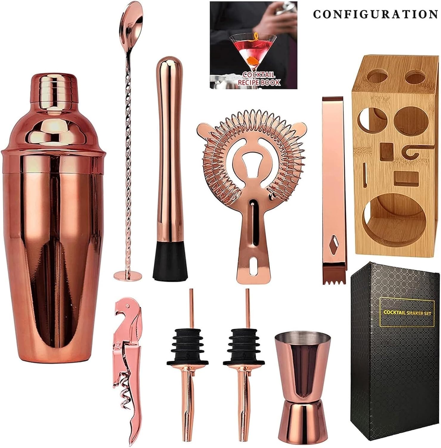 Cocktail shaker set is an ideal choice for you! The most complete kit for home bartenders. The bartender kit comes with everything you need to mix your beverage. Whether you're a professional bartender or a beginner bartender, you can enjoy the bartender kit. Recipe included. Strainer - to remove thick ice and pulp from mixed beverages. Muddler - Mash or stirrer fruits, herbs, and spices Mixing Spoon - Mix and emulsify the formula. Jigger - Accurately measure the ingredients before pouring. Shaker - Creates classic cocktails and experimental mixes. WOOD STAND - Keeps all bar tools clean and stylish. CORK OPENER - Wine corkscrew, bottle opener and foil cutter functions Ice Tongs - Transferring ice cubes or blocks into glass Pack of 10 1 x 750ml Cocktail Shaker 1 x Muddler 1 x double-sided jigger. 2 x Liquor Pourers 1 x Mixing Spoon 1 x Corkscrew 1 x Hawthorn Strainer 1 x Ice Tongs 1 x RackIf you have any questions, please feel free to contact us!