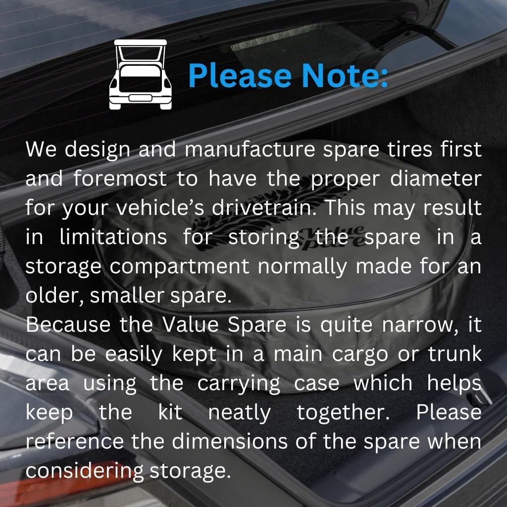 How do we provide a quality spare tire for your Model 3 along with an available spare tire changing kit at such a fantastic price? We start out by manufacturing our rugged but affordable steel wheels to our own strict specifications. Each wheel will have the precise lug bolt pattern your car uses. Nothing modified or "made to work" here. In other words, at no time will we sell a wheel that has been modified or simply adapted to fit your vehicle's precise lug bolt pattern. We combine these model-specific wheels with durable DOT "M" speed-rated radial tires. We leave behind the high cost associated with expensive name-brand tires. The best part, we do this without sacrificing quality and durability. We ensure proper fit but more importantly, we promise the correct brake clearance needed for every late-model car or SUV we support. If your vehicle is listed on Value Spare, rest assured it is designed to fit your car. Furthermore, don't forget about the importance of proper spare tire sizing. Of course, each spare is narrow to save space, however, we make certain your spare has the correct overall diameter to prevent putting strain on your vehicle. Modern drivetrains are more sensitive than ever to proper tire diameter. In other words, we've done our homework. Essentially, we have created a space-saver spare tire that is a much-improved version of the old "donut" spare once provided by carmakers. The key is making sure this accomplishment isn't expensive.