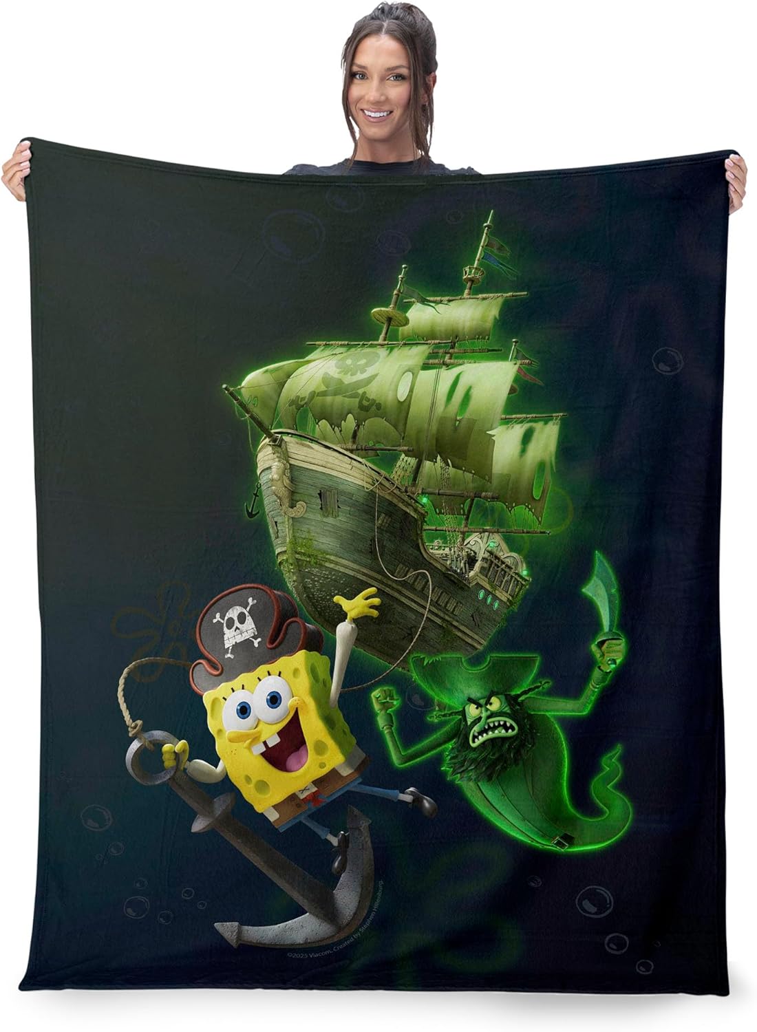 Embark on a playful quest with the SpongeBob SquarePants Search for SquarePants Silk Touch Throw Blanket. This adventurous design shows SpongeBob as a pirate with the Flying Dutchman glowing behind him. This throw measures 46 by 60 inches, the ideal size for curling up on the couch, layering on a bed, or taking along on trips. Made from silky-soft polyester, it offers cozy warmth while remaining lightweight and breathable. A neutral reverse side balances the colorful artwork, and the durable construction holds up to everyday use. Machine washable for easy care, this blanket keeps its softness wash after wash. Whether you’re decorating a themed room, lounging after a long day, or shopping for the perfect gift, this throw combines playful SpongeBob design with lasting comfort.