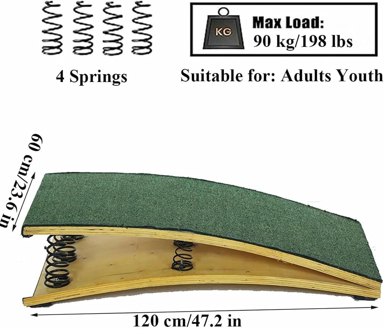 Product Description:Special curved springboard for trainingSize:Four springs 60 * 120cm/23.6 * 47.2in, capable of bearing 80kg/176.4lbsSix springs 60 * 120cm/23.6 * 47.2in, capable of bearing 90 pounds/198.4lbsNine springs 60 * 120cm/23.6 * 47.2in, capable of bearing 110 pounds/242.5lbsMaterial: High quality thickened hardwood, high-quality felt, high toughness thickened springColor: GreenLight photography and different displays may cause the color of the object in the photo to differ from the actual object, and we guarantee that its style is the same as shown in the pictureThe product is measured manually, please allow a deviation of 1-3 centimeters.The spring is made of alloy spring steel, which has strong energy storage, high elasticity, is not easy to rust, and is resistant to weak corrosive media such as air and water, as well as chemical corrosive media such as acid, alkali, and saltProduct features:Safe and durable, and easy to cleanWooden structure, sturdy and durableHigh toughness spring, improving elasticityAnti slip carpet with strong gripNo assembly requiredOur product is designed in accordance with ergonomics and can meet the training requirements of different teachers and coaches without damaging feet, greatly reducing athlete fatigue. The product does not require assembly and has strong load capacity.Widely used - Gymnastics and vault are very suitable for families, gym bars, game rooms, obstacle courses, home gyms, basements, and more.If you need more styles, please search our product "" for more other styles.