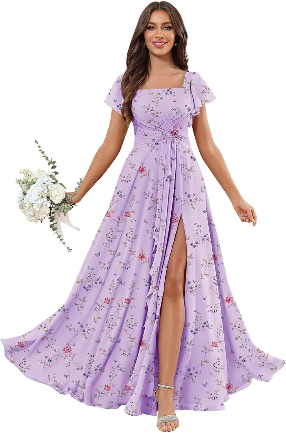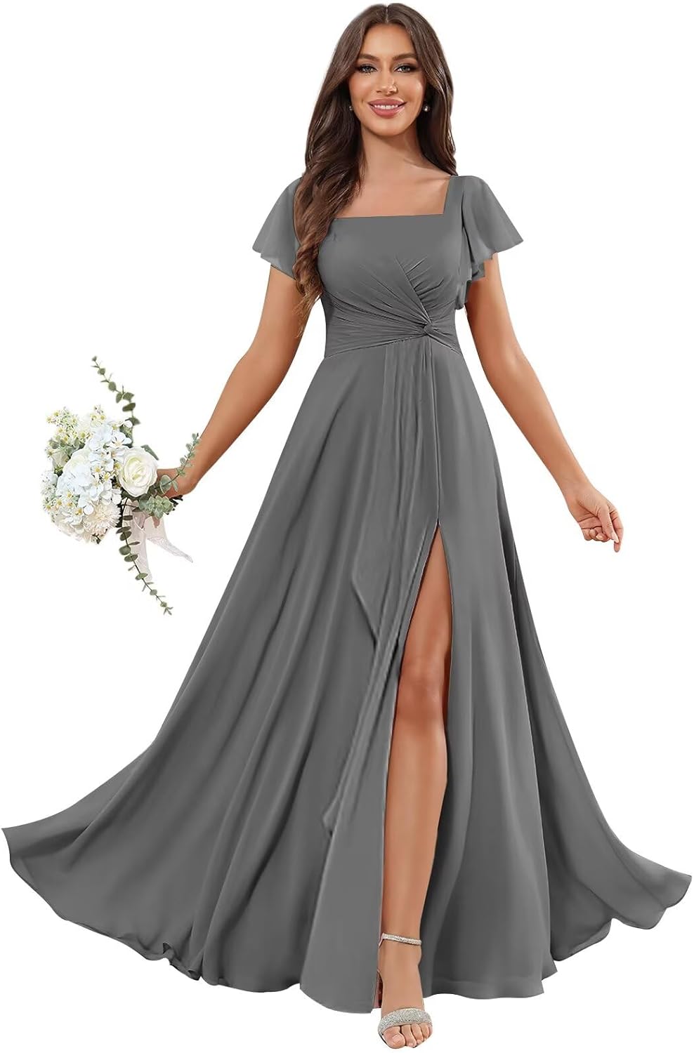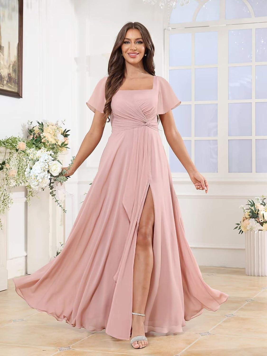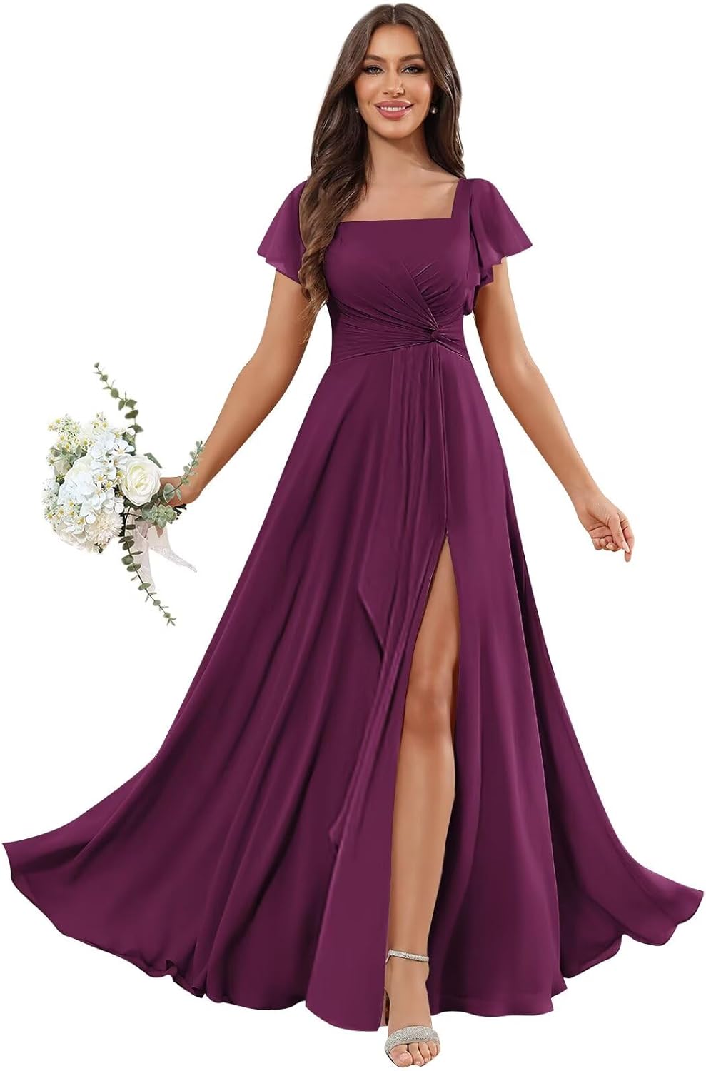 Material:Chiffon Bridesmaid Dresses Item Length:Floor Length Neckline:Square Neck Sleeve Type:Short Sleeve/Flutter Sleeve Back Design:Lace Up Back Embellishment:Slit,Ruffle,Pleated,Pockets *Occasions:This bridesmaid dress is suitable for each important moments in your life (such as wedding parties, prom, evening parties, or any other formal, semi formal occasions/events). *If you are not sure of your size, please take the measurement according to the measurement table. The measurement details are as follows: 1.Full Bust _ inch 2.Waist _ inch 3.Hips _ inch 4.Hollow to Floor _ inch We also provide other customized services. If you want you can contact customer service first to provide your specific requirements. *Why Choose Us: Several Colors for You to Pair with Unique and Fashion Design for All Women Elegant, Vintage, Simple, Modern and Popular *OTHERS: 1. The real color of the item may be slightly different from the pictures shown on website due to camera quality and monitor settings. 2. For the urgent order,please contact us to ensure you can get it on time. 3. For more information on returns or customization, please feel free to contact us.