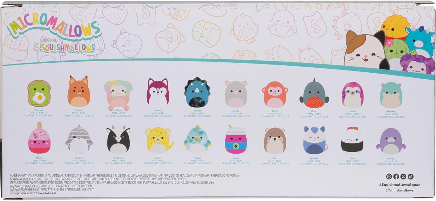 Micromallows are tiny but mighty! This Micromallows plush 20-Pack includes Squishmallows favorites Lexie the Cheetah, Gregory the Goat, Sadie the Sloth, and Kurtz the Piranha. Compatible with all Micromallows Accessory and Storage Display sets, the plush might be small but the possibilities are endless. Only by Original Squishallows. Join the Squad today!