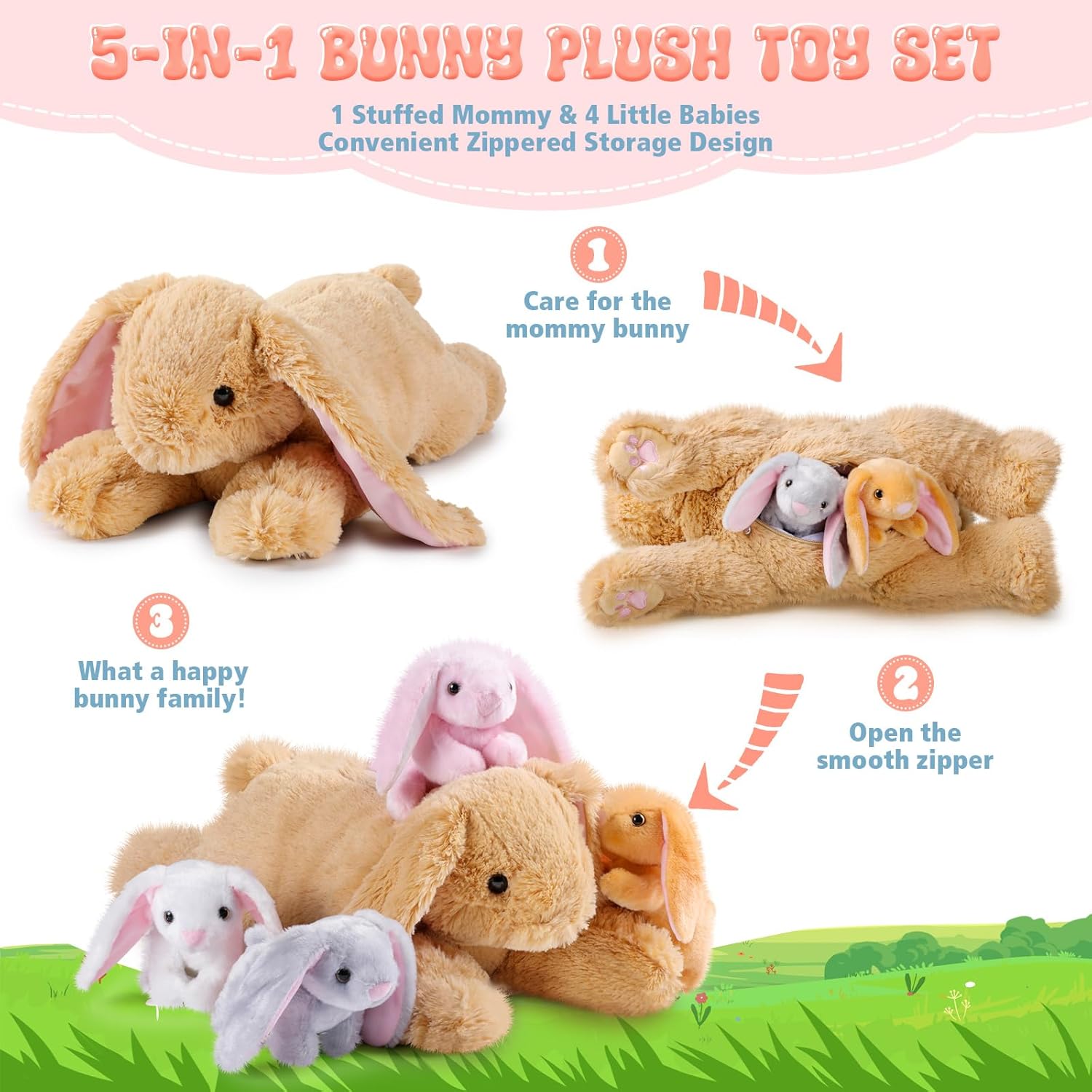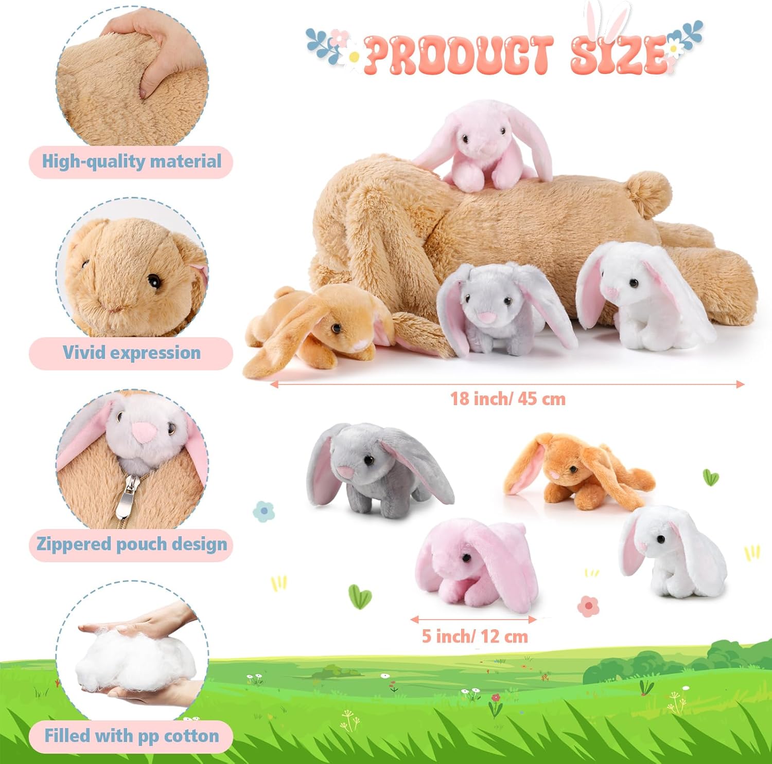 Features: The mommy stuffed bunny has a zipper on her back that you can open to help her give birth to 4 pcs baby bunny and perform the hatching process, which is an interesting way of teaching and learning The nursing bunny stuffed animal can be applied as a warm company partner while growing up or before sleeping for your family members, they will be willing to play with these plushies. Specifications: Material: plush fabric, PP cotton Color: white, pink, brown, gray Size: Mother plush toy: approx. 18 inches/ 45 cm in length Baby plush toy: approx. 5 inches/ 12 cm Package includes: 1 x Mommy stuffed bunny 4 x Small stuffed bunny Notes: Manual measurement, please allow slight errors on size. The color may exist a slight difference due to different screen displays. Due to the different postures of the dolls, the measurement methods may vary and there may be some errors, please refer to the actual object