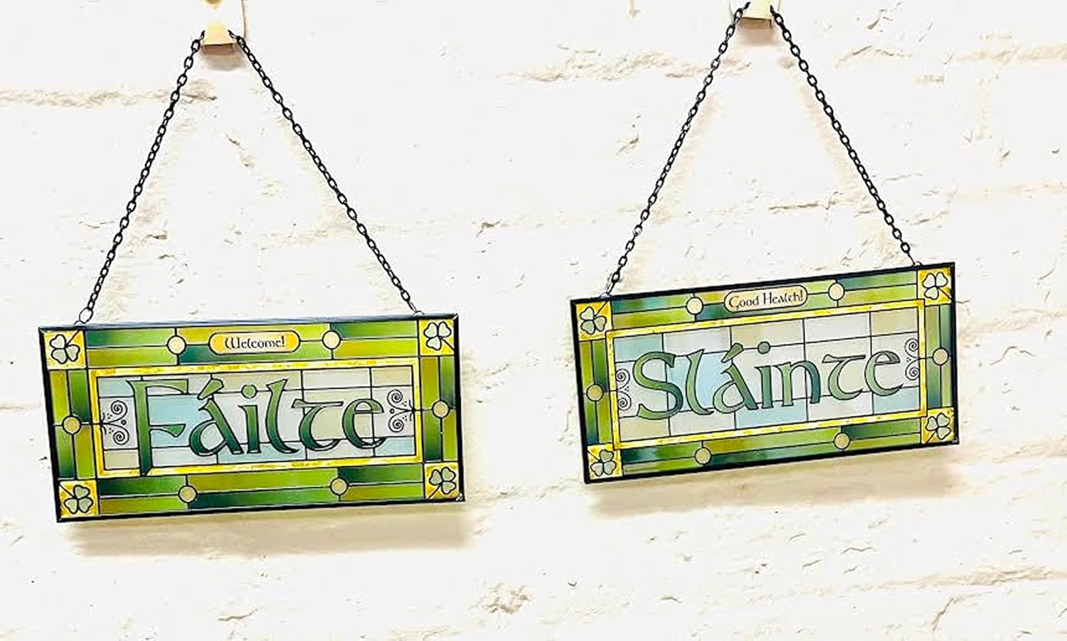 Bring a pop of Irish culture to your house with this beautiful Failte Slainte Glass Suncatcher. It consists of two wall-hanging panels hand-painted from stained glass, a durable material that lasts generations. The first panel features the “Slainte” inscription, which translates as “Welcome”. The second plaque features the “Slainte” inscription, which is a wish for good health or a way to say “Cheers” in Ireland. The four corners of both panels are also embellished with four Shamrock motifs. It is said that the three shamrock leaves were used as an example by Saint Patrick, to explain the Trinity concept to the pagan Irish, with each leaf representing the Father, the Son, and the Holy Spirit. Both wall-hanging decor pieces measure 3.7 inches by 8 inches and come with a hook that makes it easy to hang the plaques in any window of your home.