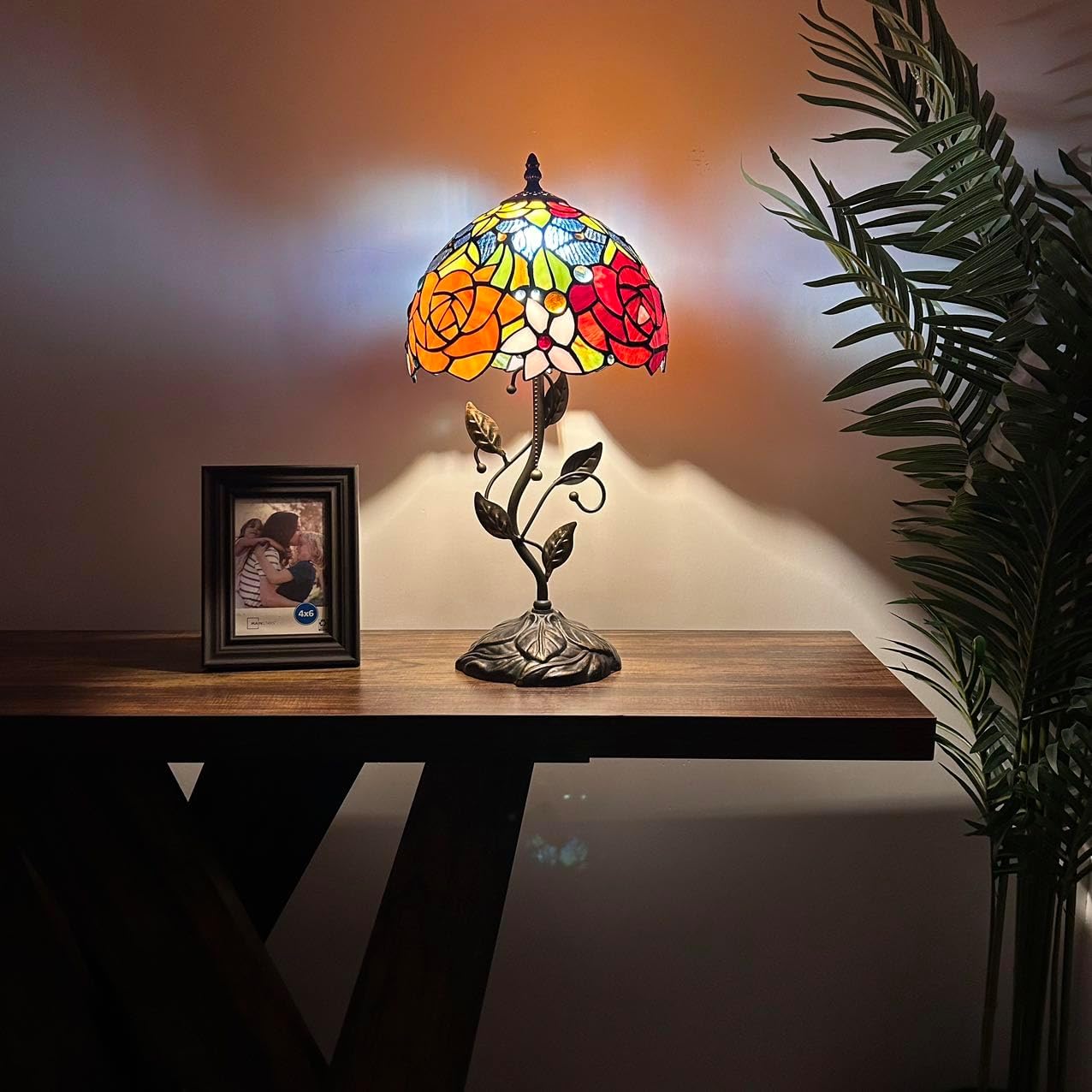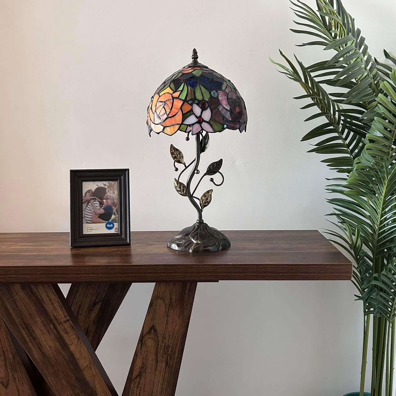 Resin and Metal Base with bronze finish. Each piece of stained glass is hand-soldered into place using the traditional copper foil technique.