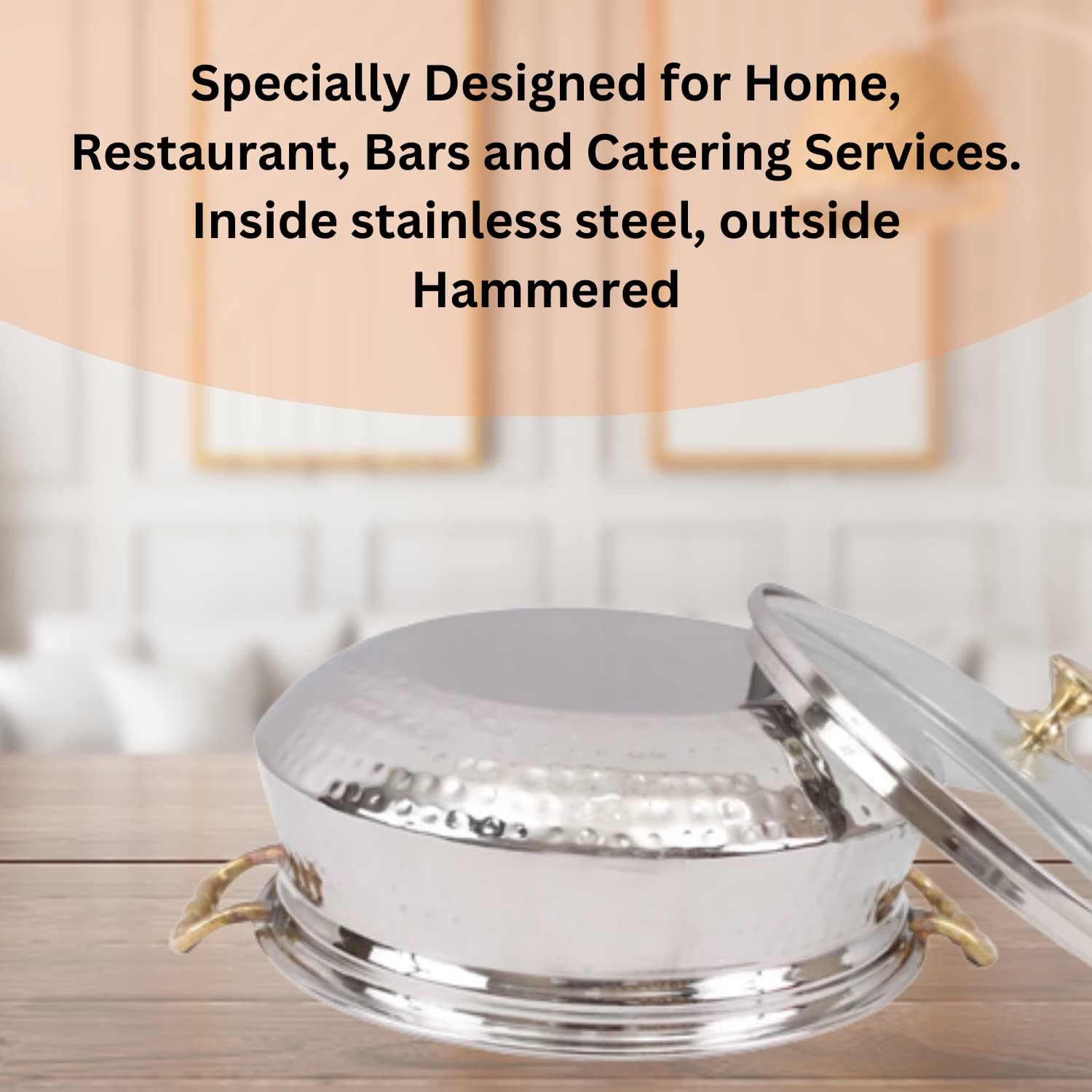 Indian style with this cooking & serving utensil set your Indian style dining experience goes several notches up. The material used is food grade. Hammered Steel is used only on the outside of the utensil and does not come in contact with the food. Only the high-quality food-grade stainless steel is in contact with the food. Two layers of metal with air cushion ensure that the food stays warm much longer. Serving dinner in this dinnerware handi would be an unforgettable experience.