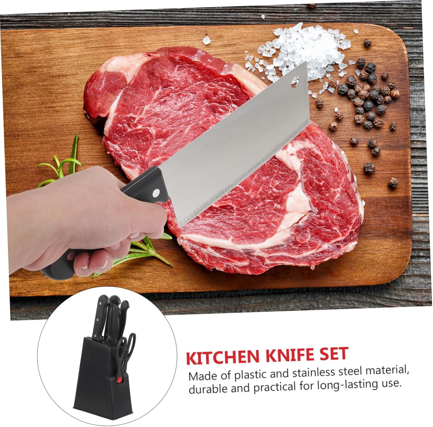 Package List 1 x set of kitchen set Features -Fruit :17.5cm/6.88inch (Total Length),8cm/3.15inch ( Length), 9.5cm/3.74inch (Handle Length), 0.8mm/0.03inch ( Thickness) kitchen holder -Material:Stainless steel and plastic kitchen supplies -Color:Black kitchen scissors heavy duty -Scissor :21cm/8.27inch (Total Length),1mm/0.04inch ( Thickness) food kitchen scissors -Size:20.4x15.5x8cm/8.3x6.1x3.15inch. (Knives Block) chef knives kit -Bread :26.3cm/10.35inch (Total Length),15.3cm/6.02inch ( Length), 11cm4.33inch (Handle Length), 0.8mm/0.03inch ( Thickness) -Sharpening bar:26cm/10.24inch (Total Length),16.5cm/6.5inch (Blades Length),9.5cm/3.74inch (Handle Length), 0.6mm/0.02inch(Diameter) -Slicing :29.5cm/11.61inch (Total Length),17.5cm/6.88inch ( Length), 12cm/4.72inch (Handle Length), 1mm/0.03inch ( Thickness) -Chef :26cm/10.24inch (Total Length),15cm/5.90inch ( Length), 11cm/4.33inch (Handle Length), 0.8mm/0.03inch ( Thickness) - :28.5cm/11.22inch (Total Length),17cm/6.69inch ( Length), 11.5cm/4.53inch (Handle Length), 1.44mm/0.55inch ( Thickness) - Stainless steel can be used for all kitchen applications, meats, mincing, chopping vegetables and , slicing fruits knives kitchen.Goods Informationkitchen If you are looking for -looking and easy-to-use kitchen cutters set, then this must be your choice.kitchen scissors heavy duty You can use it yourself or give it as a housewarming present to your friends or relatives.utility knives kitchen Multi-function cutters made of stainless steel are very