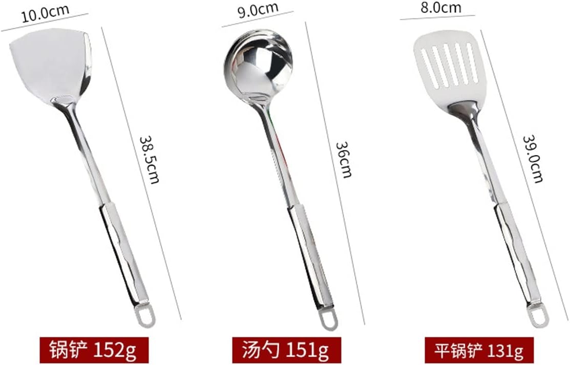 Kitchenware set, made of food contact material with comfortable grip and hanging hole design for easy storage, reassuring material. Kitchenware is easy to clean and helpful in cooking. It is also a skilled stir fryer, easy to pick up food, anti scalding and anti slip, lightweight and easy to use.Cooking utensil sets is a good gift for housewarming, birthday, Christmas, thanksgiving. Perfect for loved ones that like to cook, chefs, or even for your own personal use. If you are cooking enthusiasts, this cooking utensil set will be a good choice.Product Name: Cooking Utensil SetsMaterial: Stainless steelColor: silverProduct features: environmentally friendly,durable, safe, easy to cleanMaterial: 304 Stainless Steel.Weight: 830gUses: cooking, soup, fried, etc.Placement: family, kitchen, etc.*Package comes with 1 spatula, 1 fried shovel, 2 soup spoon, 1 leaking shovel, 1 revolving utensil rack.Selling point:Food grade silicone, baby-like careNo deformation, no damage to the pot, easy to clean, no cracking, soft materialNote: Light shooting and different displays may cause the color of the item in the picture a little different from the real thing,Thank you for your understanding. Please allow 1-3% error due to manual measurement.Please make sure you do not mind before you bid.After sales: Our products undergo a rigorous quality inspection, please rest assured to buy,Our products and services will not let you down, If you have any questions, feel free to contact us and we will provide you with the best service. thank you for your support to our store. I wish you and your loved ones good healt