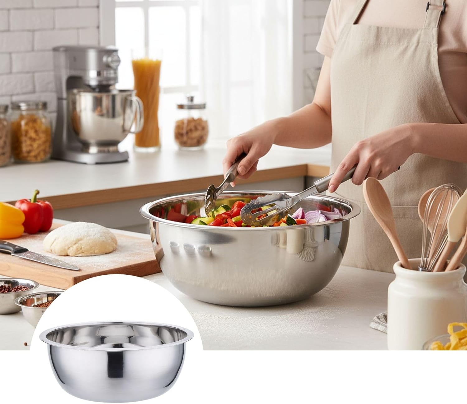 This stainless steel is designed for and hygienic use across a variety of kitchen settings. Engineered with a deepened structure, it securely holds ingredients during food washing, mixing, marinating, or storage. Its seamless, smooth interior resists stains,, and while allowing effortless cleaning. Made from stainless steel, each commercial kitchen mixing bowl delivers exceptional strength and longevity, performing reliably under daily heavy use. With its polished finish and professional shape, this prep bowl serves as a versatile essential for cooking, baking, salad prep, dough rising, and more. Whether in a home kitchen or busy dining hall, the lightweight yet sturdy design ensures comfort and efficiency. One included per package, available in multiple sizes to suit any food preparation demand.