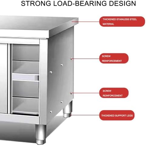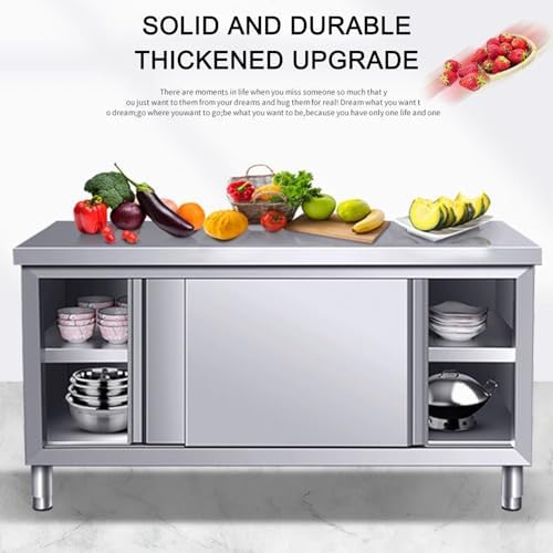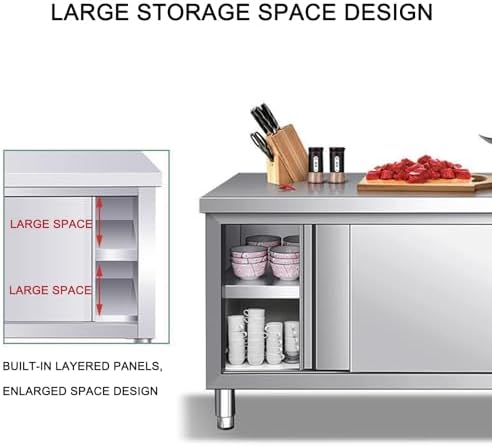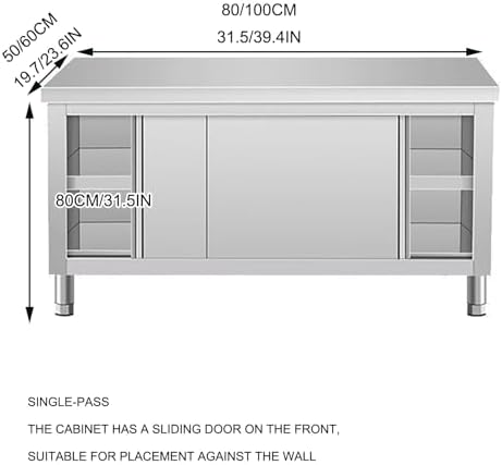 Introducing our Stainless Steel Prep Table, a versatile solution designed for commercial kitchens, restaurants, hotels, and workshops. Crafted from premium stainless steel, this heavy-duty worktable features a robust, thickened design with a smooth, polished surface that not only enhances the aesthetic appeal but also ensures exceptional durability and rust resistance. This means your table will maintain its pristine look even with regular use. One of the standout features of our workbench is its adjustable leg design, which allows you to customize the height for optimal stability, accommodating various tasks and user preferences. Whether you’re prepping meals, assembling ingredients, or organizing tools, this table ensures a comfortable and safe working experience. The integrated sliding door, operating seamlessly on an innovative track, provides easy access to your stored items, making your workflow more efficient. The built-in partition offers a spacious double-layer storage area, perfect for keeping your kitchen essentials organized and within reach. The single-pass cabinet with a sliding door is designed for convenient wall placement, maximizing your workspace while minimizing clutter. With dimensions available in multiple sizes (80*50*80cm, 80*60*80cm, 100*50*80cm, and 100*60*80cm), this multifunctional prep table can be tailored to fit various settings and needs. Assembly is required, so be sure to wear gloves during installation to handle the stainless steel safely. Elevate your cooking and prep experience with our Stainless Steel Prep Table—a blend of functionality, durability, and style that meets the demands of any professional environment.