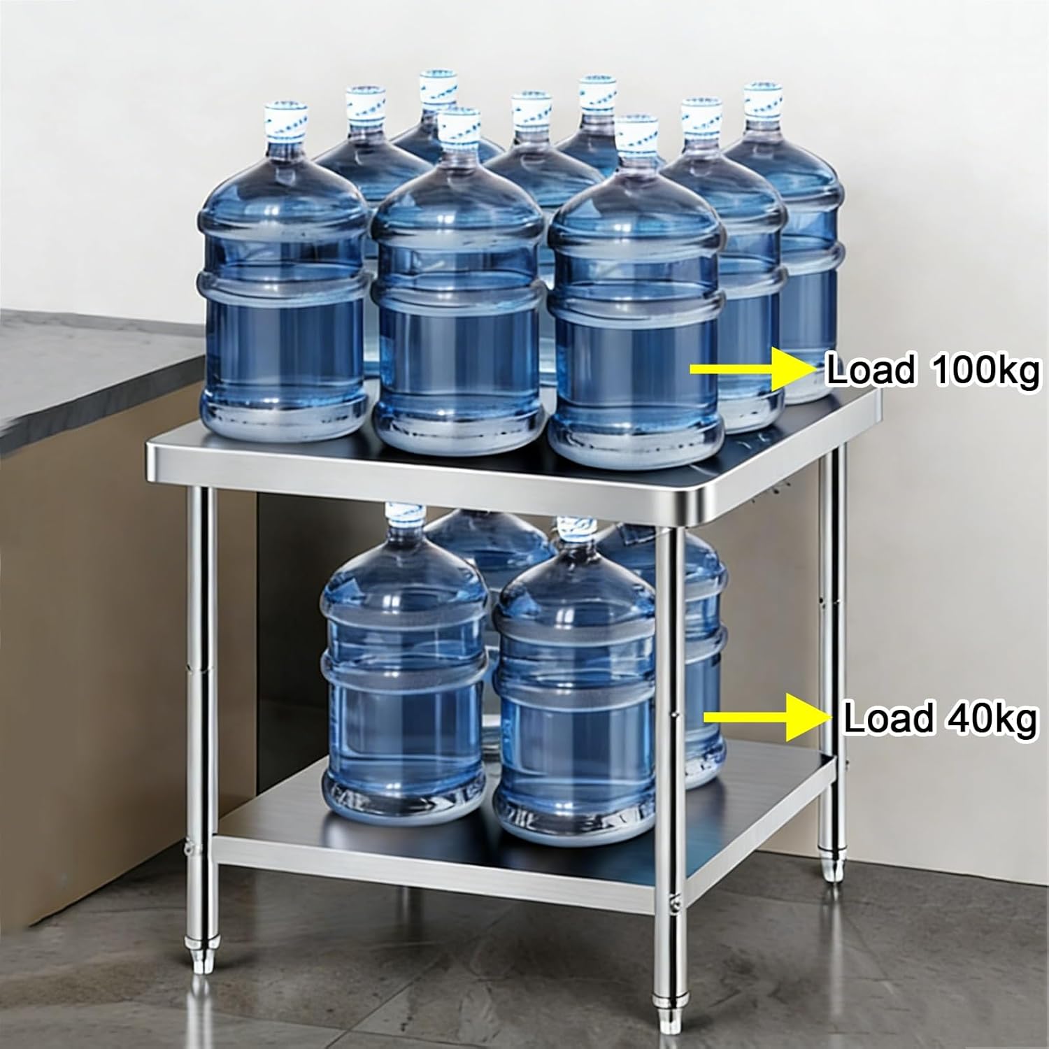 Product Specifications:Product Name: Stainless Steel WorkbenchMaterial: Stainless SteelColor: SilverLoad ability:Worktop: 100kgAssembly Required: YesDimensions:L60xW40xH80cm (23.6x15.7x31.5in)L80xW40xH80cm(31.5x15.7x31.5in)L100xW40xH80cm(39.4x15.7x31.5in)L120xW40xH80cm(47.2x15.7x31.5in)L70xW50xH80cm(27.6x19.7x31.5in)L80xW50xH80cm(31.5x19.7x31.5in)L90xW50xH80cm(35.4x19.7x31.5in)L100xW50xH80cm(39.4x19.7x31.5in)L120xW50xH80cm(47.2x19.7x31.5in)L60xW60xH80cm (23.6x23.6x31.5in)L70xW60xH80cm (27.6x23.6x31.5in)L80xW60xH80cm (31.5x23.6x31.5in)L90xW60xH80cm (35.4x23.6x31.5in)L100xW60xH80cm (39.4x23.6x31.5in)L120xW60xH80cm (47.2x23.6x31.5in) L80xW80xH80cm(31.5x31.5x31.5in)L100xW80xH80cm(39.4x31.5x31.5in) L120xW80xH80cm(47.2x31.5x31.5in)Product List: Workbench x 1 + Installation AccessoriesNote:1. Product dimensions may vary by 1-3cm due to measurement tool differences.2. Color differences may occur due to photography equipment, methods, and lighting conditions.3. Surfaces scratches and weld points may be present due to stainless steel welding processes, but these do not affect normal use.