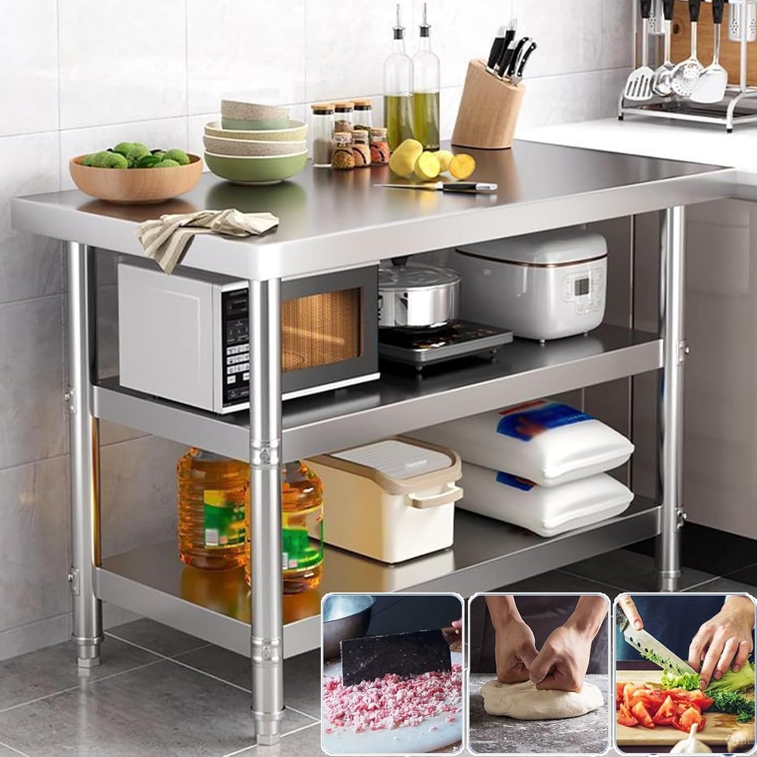 Tiered Shelving Design: Maximizes vertical storage spaceRotatable Adjustable Feet: Effortlessly accommodates uneven flooringProduct Name: Multifunctional Workbench Storage RackMaterial: Stainless SteelTier Count: 3 tiersDimensions: Height: 80 cmSuitable Locations: Kitchens, back-of-house areas, dining roomsDimensions:80x40x80cm/31.5x15.7x31.5” , 90x40x80cm/35.4x15.7x31.5”, 100x40x80cm/39.4x15.7x31.5”, 120x40x80cm/47.2x15.7x31.5”, 80x50x80cm/31.5x19.7x31.5”, 90x50x80cm/35.4x19.7x31.5”, 100x50x80cm/39.4x19.7x31.5”, 120x50x80cm/47.2x19.7x31.5”, 80x60x80cm/31.5x23.6x31.5”, 90x60x80cm/35.4x23.6x31.5”, 100x60x80cm/39.4x23.6x31.5”, 120x60x80cm/47.2x23.6x31.5”, 100x70x80cm/39.4x27.6x31.5”, 120x70x80cm/47.2x27.6x31.5”, 100x80x80cm/39.4x31.5x31.5”, 120x80x80cm/47.2x31.5x31.5”Product Contents: Workbench x 1 (excluding other items)Important Notes:Stainless steel products may exhibit slight welding marks due to manufacturing processes.Minor countertop scratches may be present on stainless steel components.All dimensions are manually measured and may have slight variations.Images may show slight color differences due to shooting angles and lighting conditions.